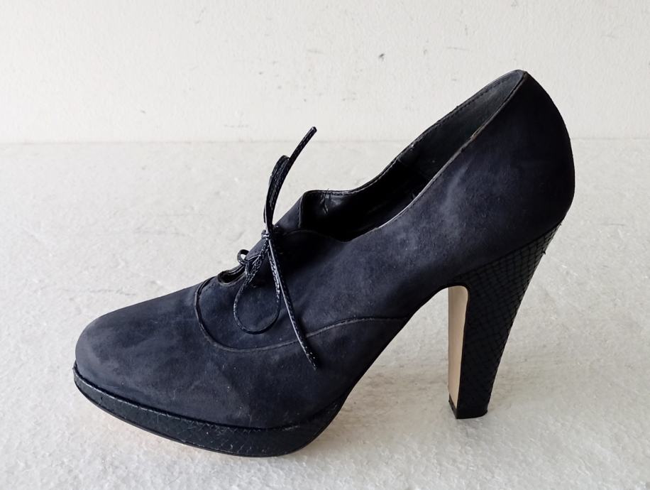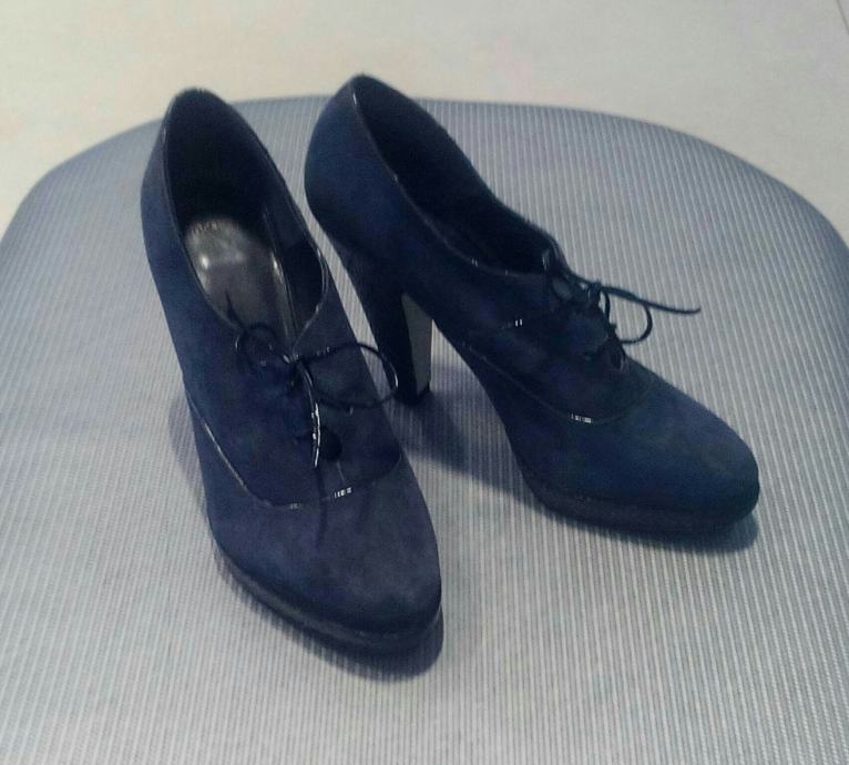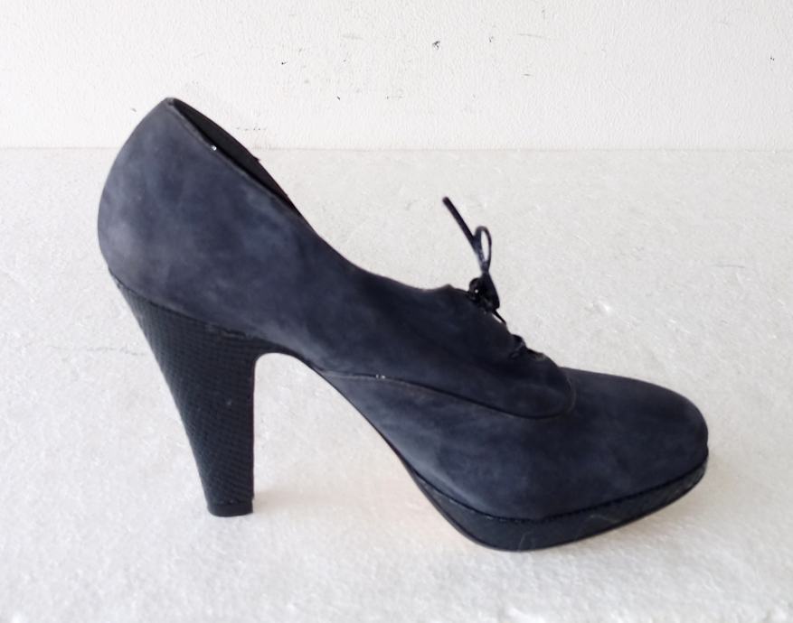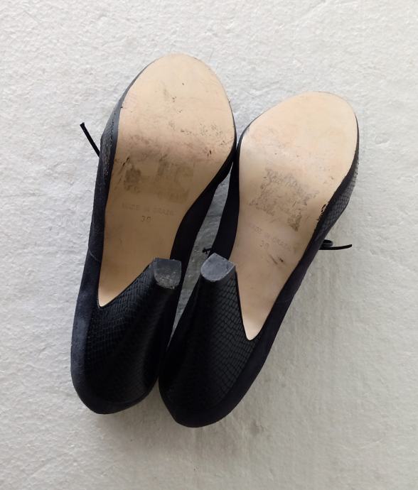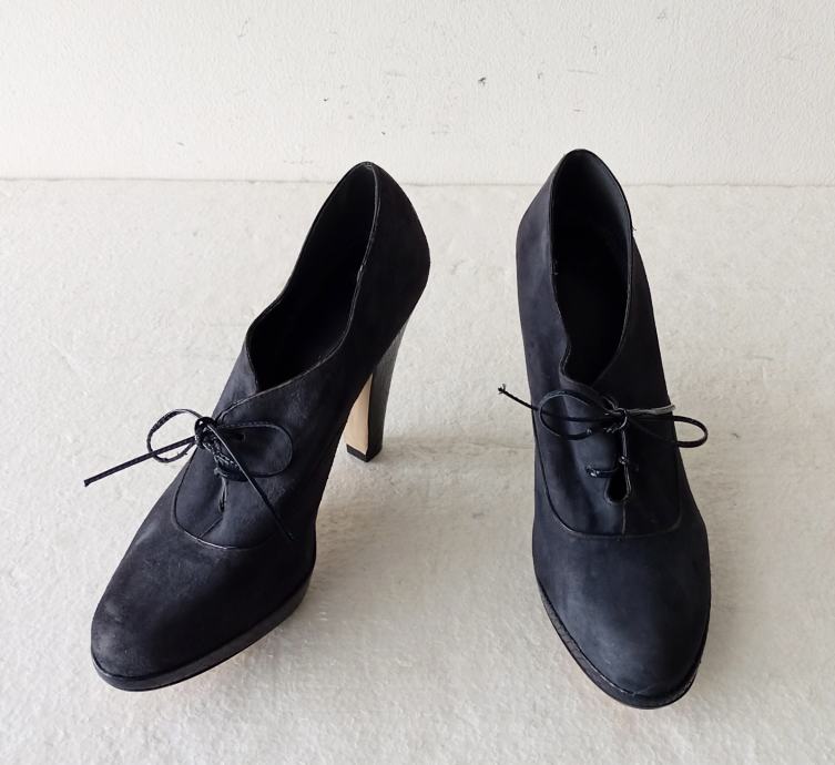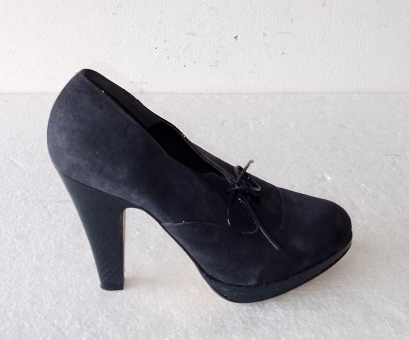 Elegantne Topshop cipele (made in Brazil), deklarirane veličine 39, ali su realno 38). Gornjište izrađeno od prirodne velur kože sive boje, sa crnim kožnim lak vezicama. Iznutra duod glatke kože, sa džonovima i petom od prave zmijske kože sa ljuskicama. Peta je visine 11 cm, a džonovi 2 cm. Obuvene doslovno jedan put.