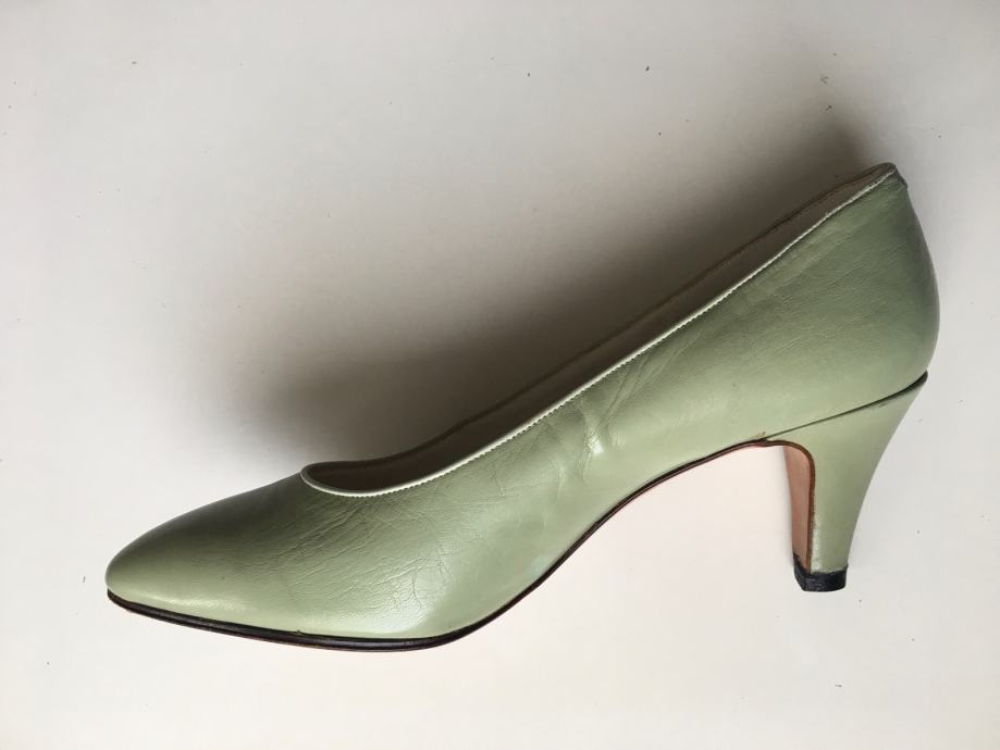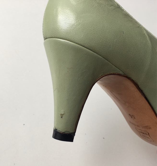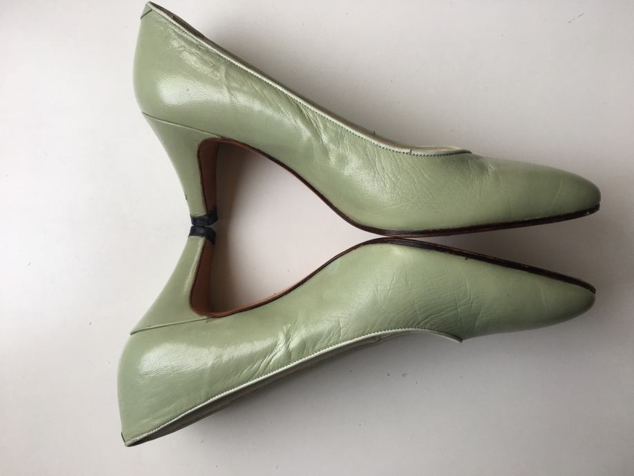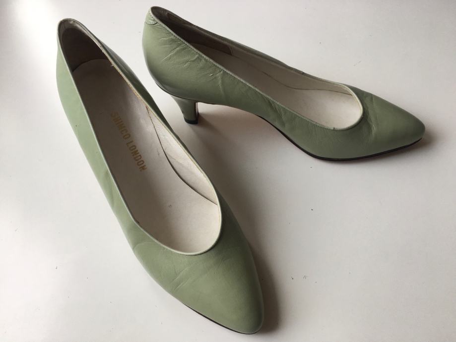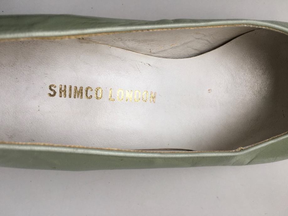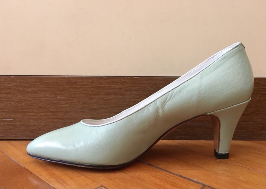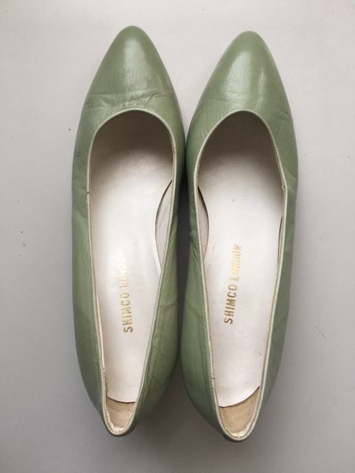 Prelijepe očuvane vintage salonke iz 1950-ih godina, (ili eventualno retro vintage: izrađene 80-ih u stilu 50-ih) sa petom od 6 cm, marke SHIMCO London, proizvedene u Italiji. Ručno izrađene prema narudžbi, sve koža. Logo "zlatno" otisnut iznutra, a "Made in Italy" te oznaka za prirodnu kožu na đonu. Potplate na petama promijenjene, potpuno nove, tako da cipele ne zahtijevaju nikakve popravke. Boja diskretna biljeda zelena ("mentol"). Već prema osvjetljenju i okolini, cipele djeluju intenzivnije ili pak hladnije, bljeđe zelene boje, što se vidi na priloženim fotografijama. Uzduž gornjeg ruba paspulirane kožnom trakom, 2-3 mm širokom, još svjetlije nijanse blijedo zelene.