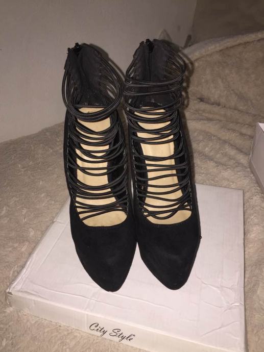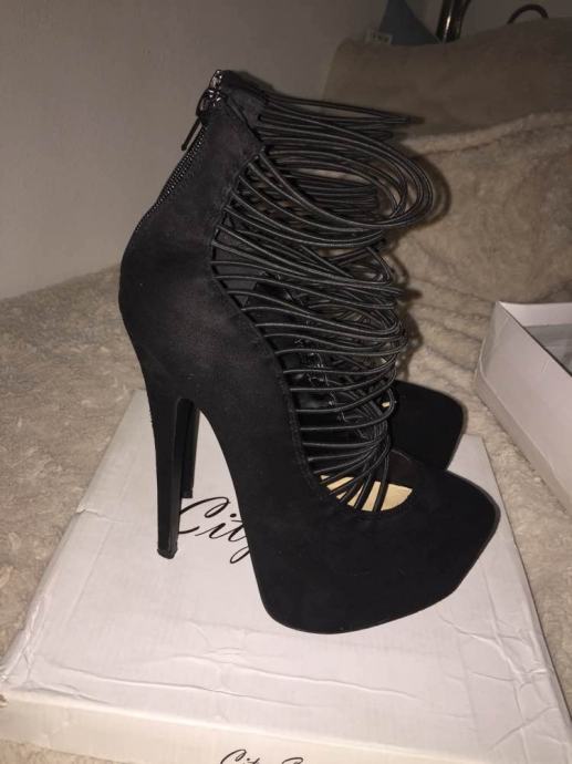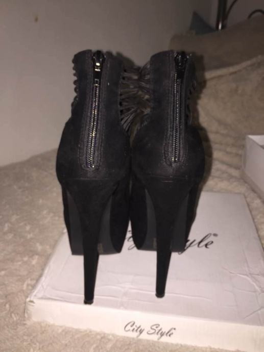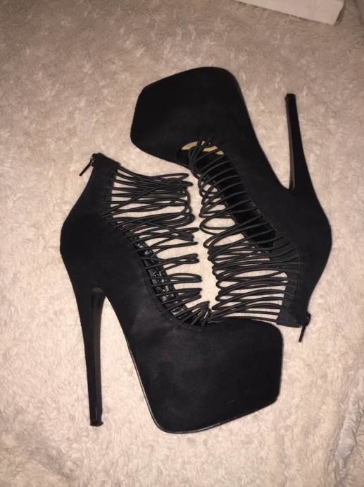 Visoke crne stikle s platformom, jednom nosene. Placene 400 kn. Dosta stabilne zbog gumica koje drze nogu.
