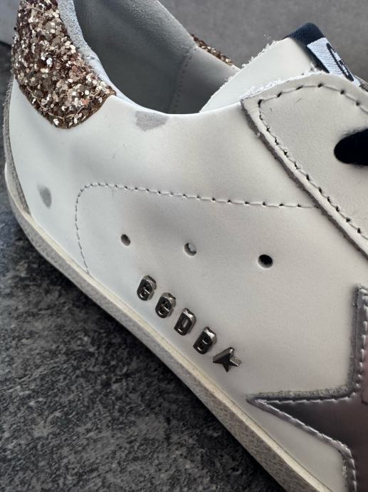 Women's white leather Super-Star with glittery heel tab