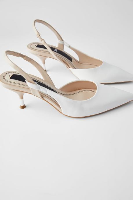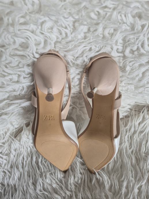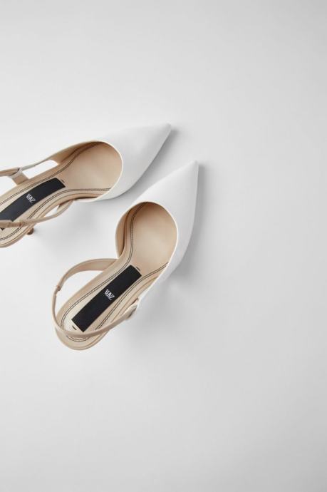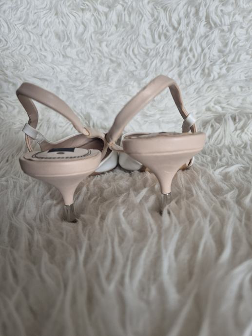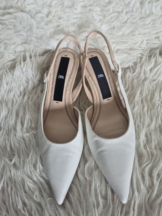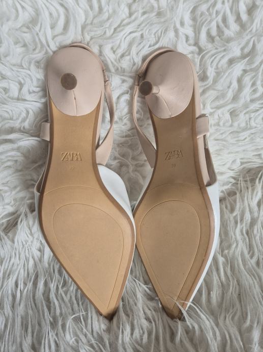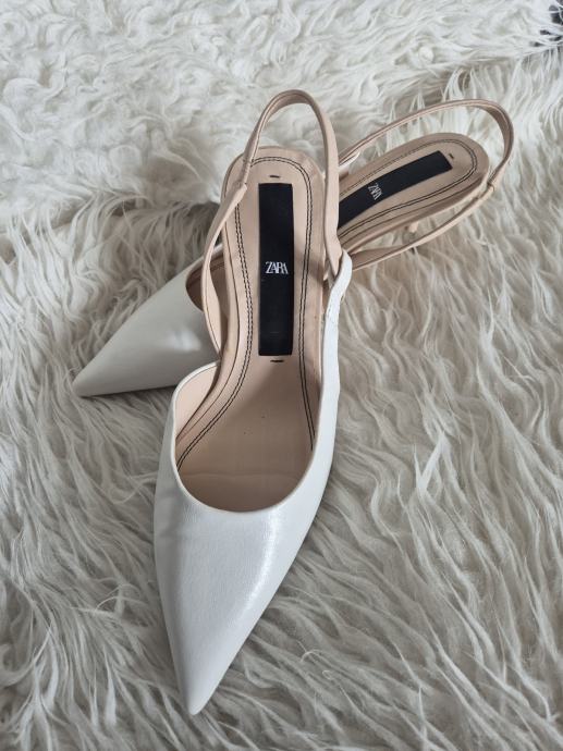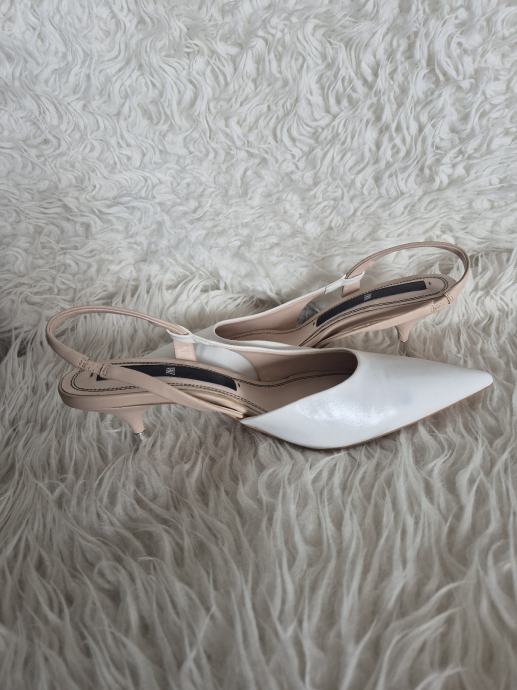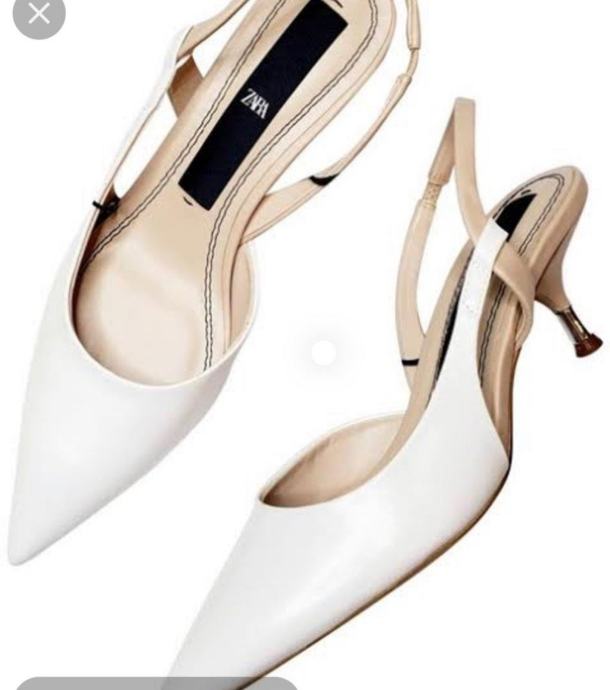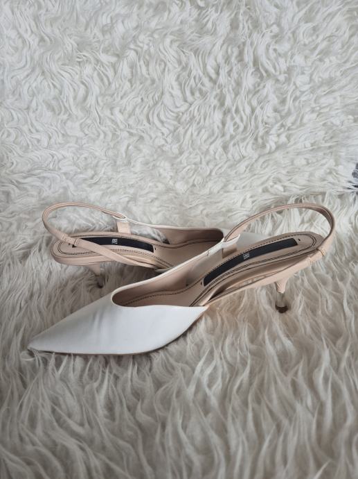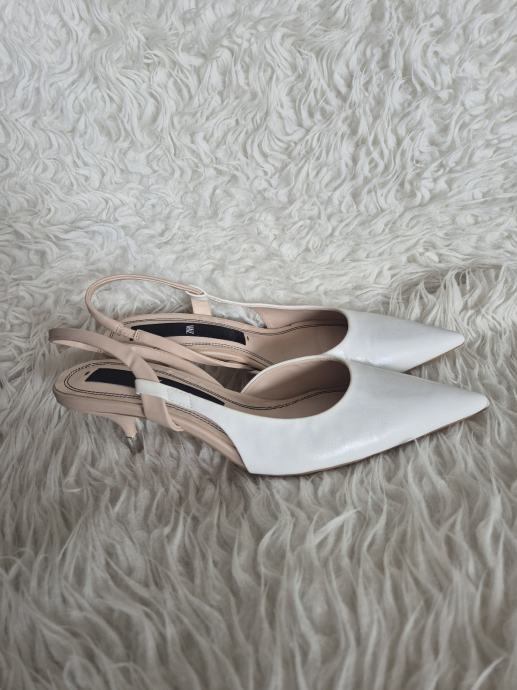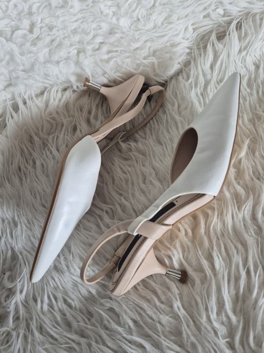 Prodajem Zara cipele/sandale tipa slingback u bijeloj boji, veličina 39. Radi se o modelu s istaknutim šiljastim prednjim dijelom i remenom oko pete. Visina pete iznosi 5 cm, što ih čini udobnima za duže nošenje, a istovremeno daje elegantan izgled. Unutrašnjost je u bež tonu.