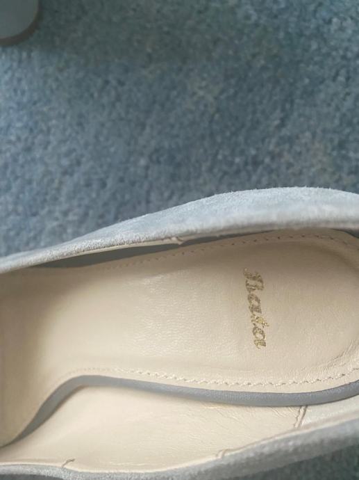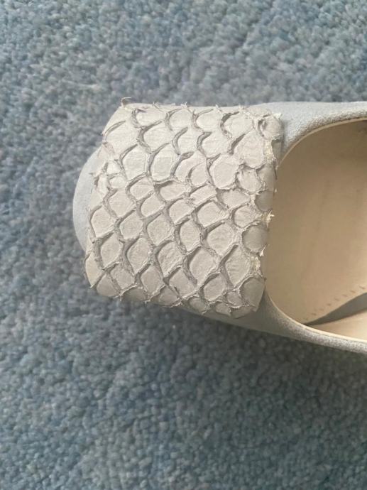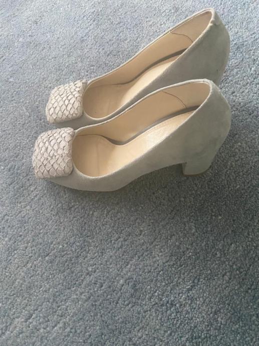 Brusena koza sa snalom od prirodne koze svjetlo plavo-sive boje, velicina 36. Nosene samo par puta. Visina pete 8cm.