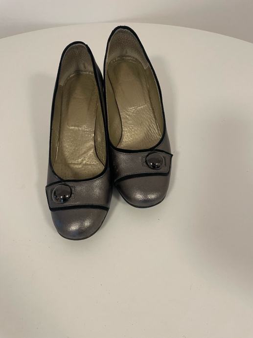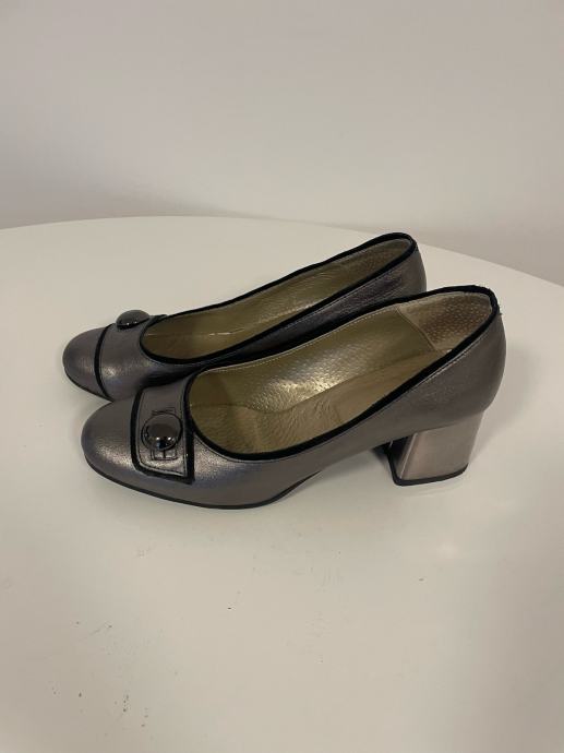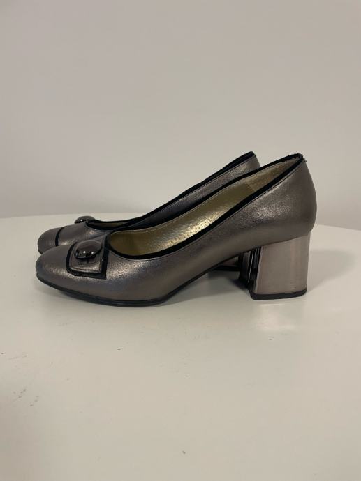 Elegantne kožne cipele veličine 38 u sjajnom metalik sivom tonu s ukrasnim gumbom na prednjem dijelu. Cipele su malo nošene i u odličnom stanju, s udobnom srednjom petom koja je savršena za svakodnevno nošenje. Visokokvalitetna izrada od prave kože garantira udobnost i dugotrajnost.