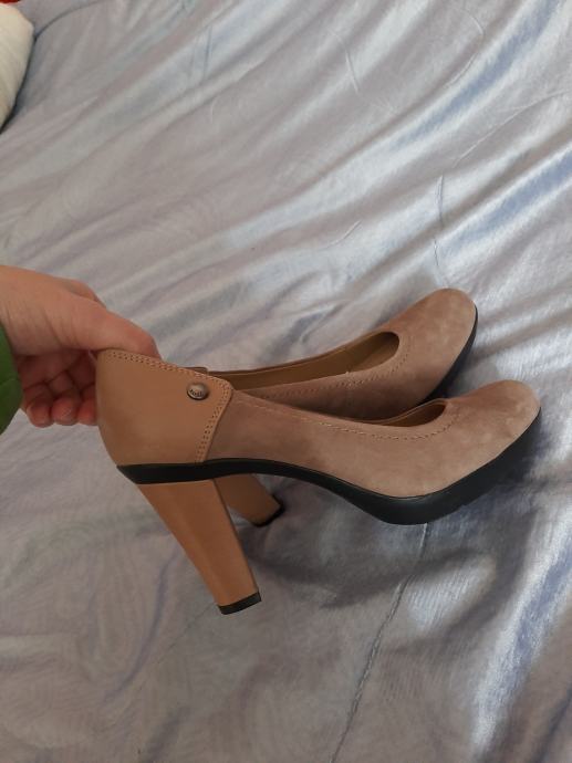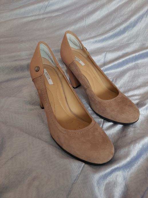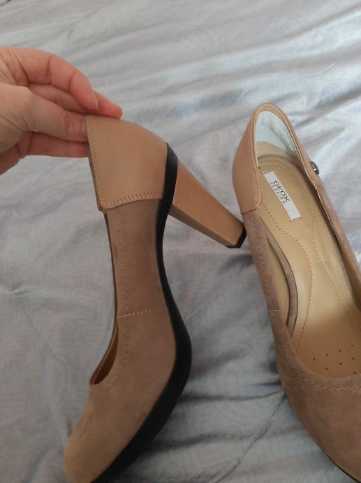 Prekrasne potpuno nove ženske štikle Geox na širu stabilnu petu. Izvana velur koža u kombinaciji sa kožom. Tabanica prozračna. Vrlo udobne. Visina pete 8cm, Visina đona 1.5cm. Vel. 35.5