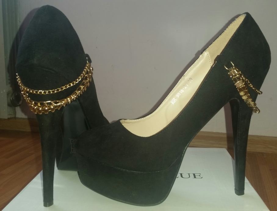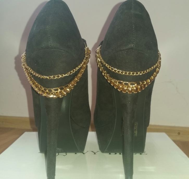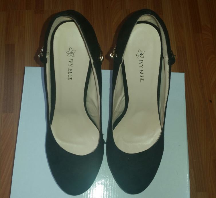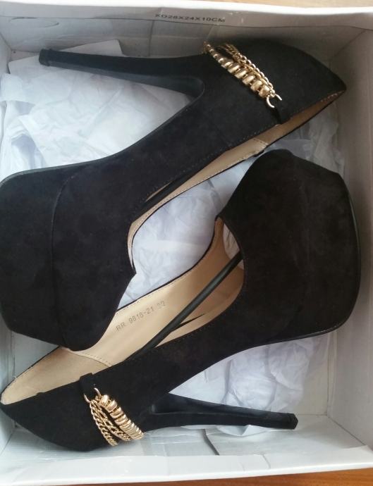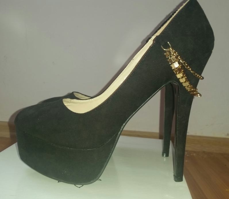 Crne velur štikle sa petom od 15cm, platforma je 4cm i broj 39, ali su malo vece pa vise odgovaraju na broj 40. Nove su i nekorištene jer su kupljene prevelike.