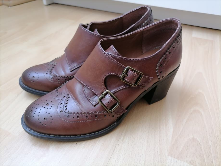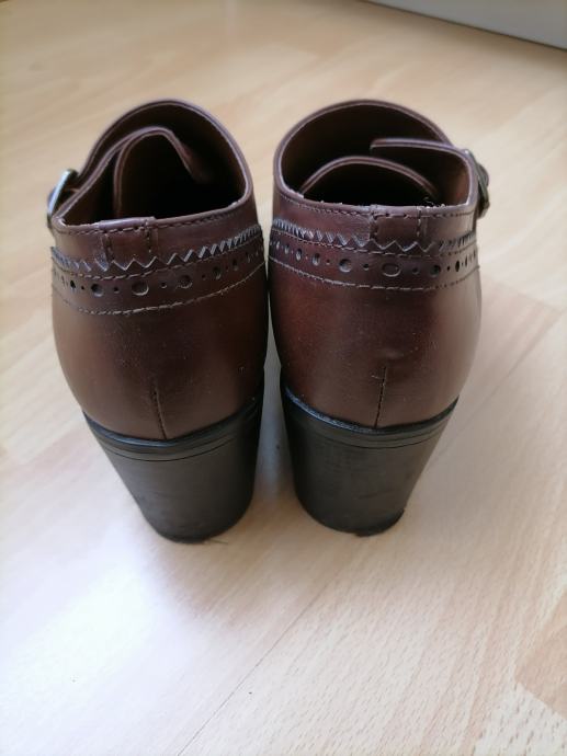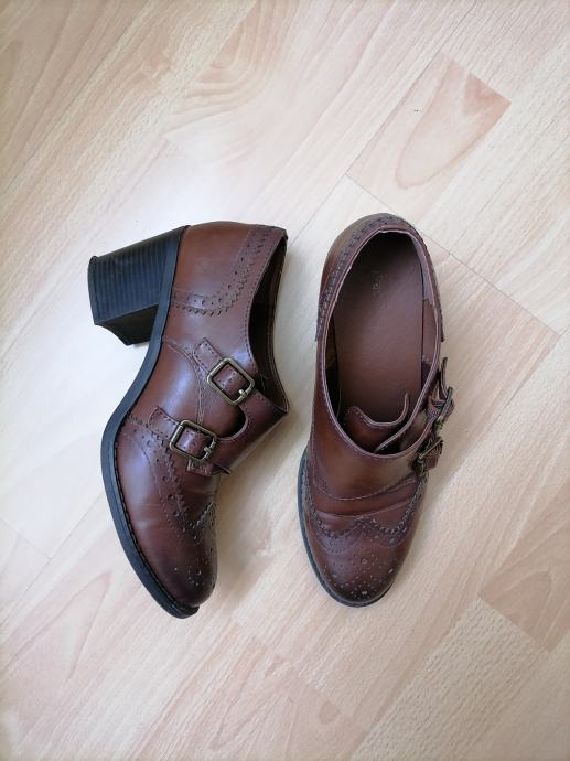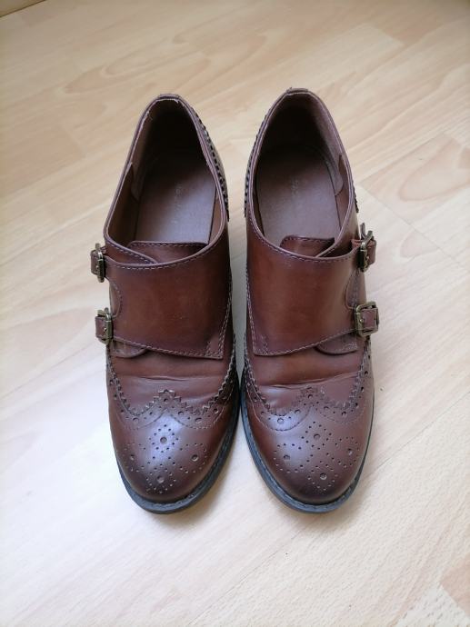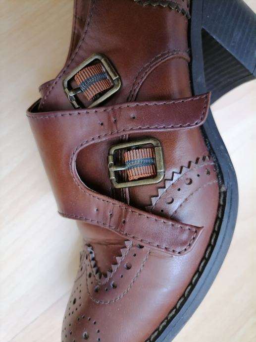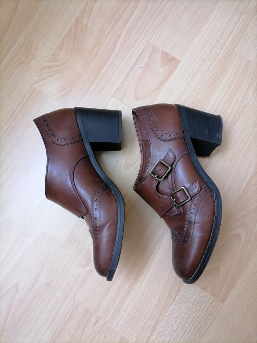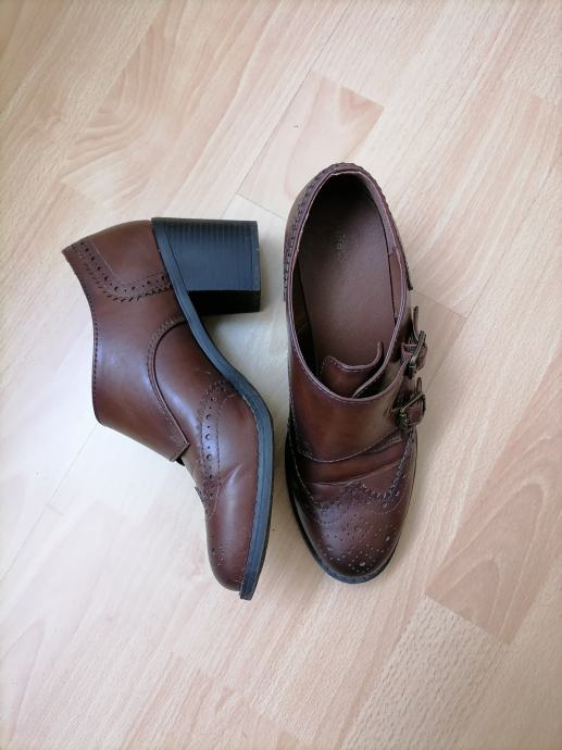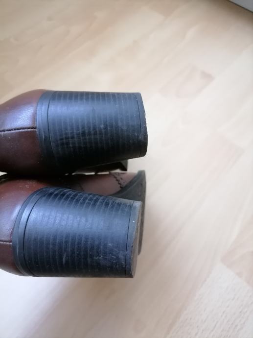 Smeđe visoke cipele, dva remenčića na kopčanje. Peta visine cca 7 cm. Stabilne, čvrste. Oxford stil. Iz Deichmanna.