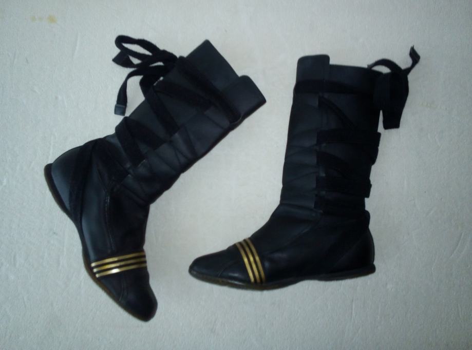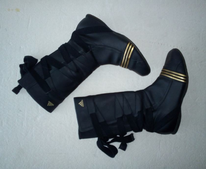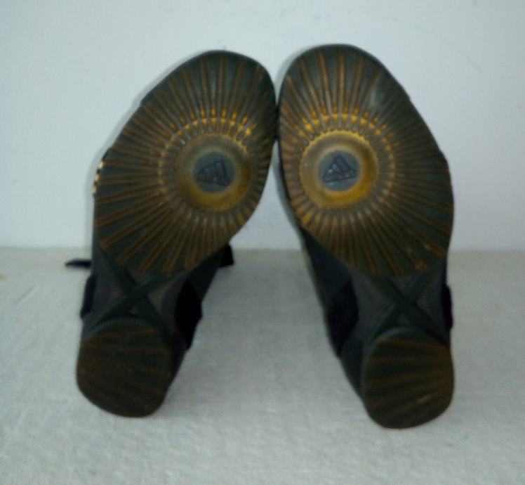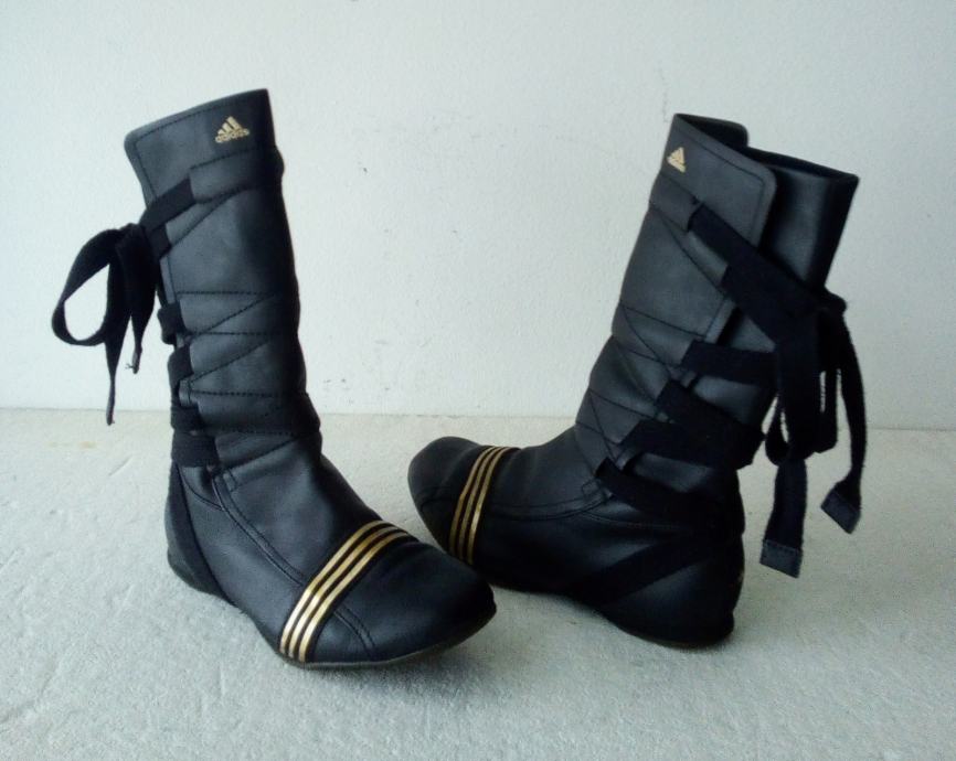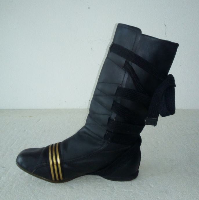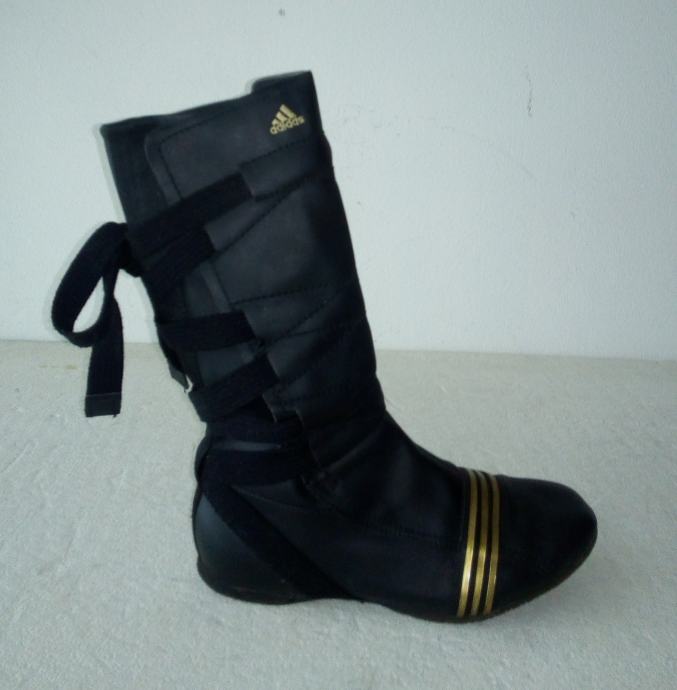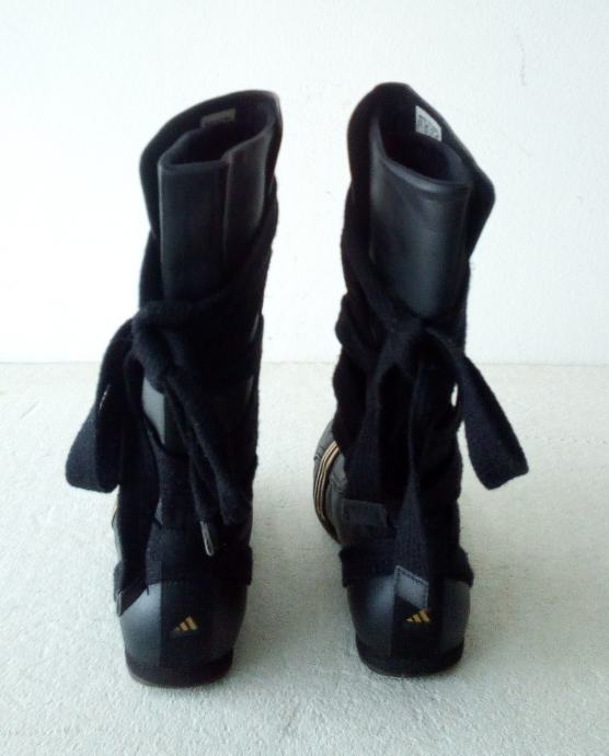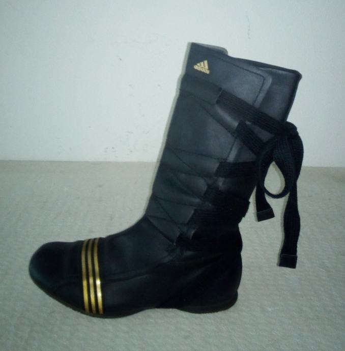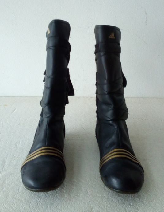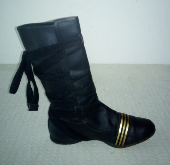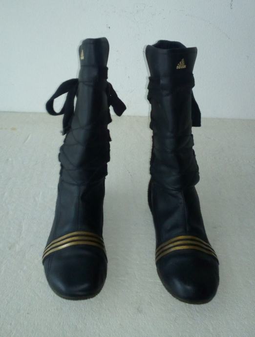 Posebne i zanimljive ADIDAS crne čizmice sa širokom pamučnom ukrasnom vrpcom. Veličina je 37 (gazište uloška je 24 cm). Izrađene od kvalitetnog skaja koji se ne guli. Sara ima odvojenu prednjicu i zadnjicu, pa se može prilagoditi različitim opsezima listova. Imaju FitFOAM mekane i vadive uloške. Potpuno očuvane, jer su malo korištene.