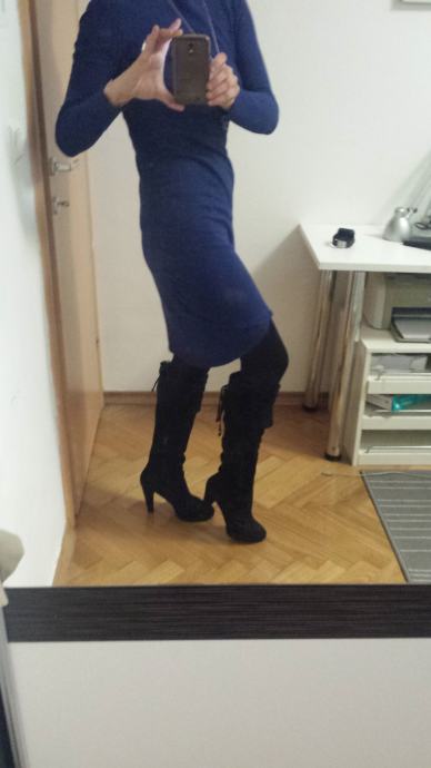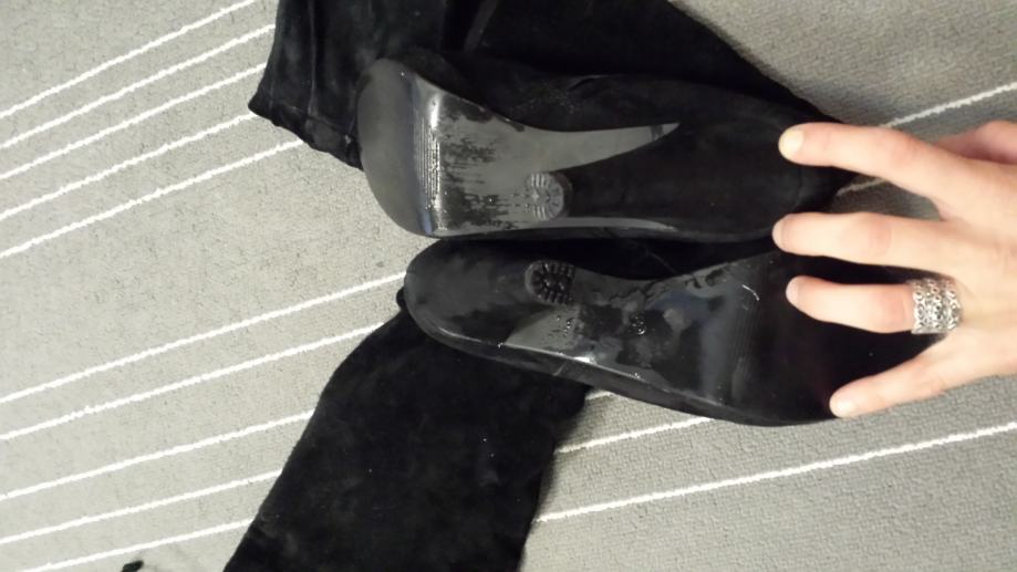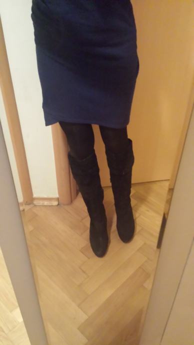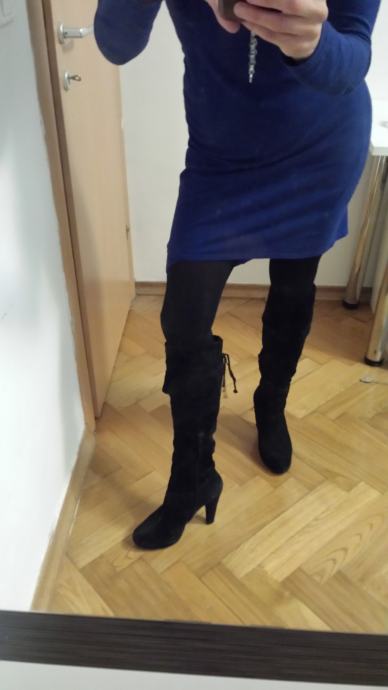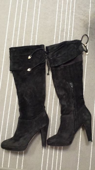 Kvalitetne Bata čizme od brušene kože. Br. 39. Nošene 2-3 puta, u iznimno očuvanom stanju, ni ogrebane (još mirišu na tvornički miris), original potpetice i neoštećeni patentni zatvarači. Visina potpetice 11cm, gaz stopala 24,5 - 25cm. Visina "nogavice" do ispod koljena. Pozadi imaju male konopčiće koji se zavežu a na krajevima konopčića 2 zlatna ukrasa u obliku srca. Možete ih isfurati za svaku prigodu, izuzetno su udobne jer je unutra isto koža a i peta je nekako eto takva. ;) Plaćene preko 1000kn, prodajem za 450kn. Snosim troškove Tisak transporta. Šaljem slike poslanog paketa i na raspolaganju sam za upite. Ukoliko ste u Zagrebu, može i primopredaja. Sretno nam bilo! :)