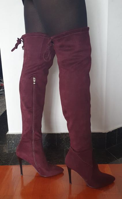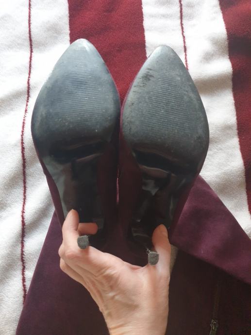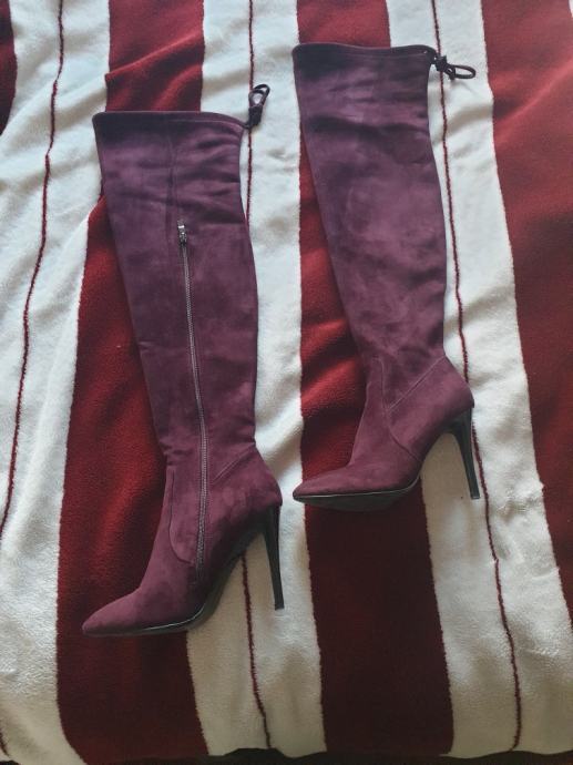 Plaćene preko 500kn. Boja ljubičasta/bordo. Idu iznad koljena, obukla sam ih svega par puta. Materijal je neki umjetni. Stabilne su i nije teško hodat u njima. Duljina unutarnjeg gazišta 25.6cm. Visina pete malo manje od 11cm,visina čizme mjereno od pete do vrha 68cm. Prekrasno idu na hlače/suknje/haljine. Cijena sa slanjem 35 eura osobno preuzimanje 33 eura. Osobno preuzimanje ISKLJUČIVO na Cvjetnom ili trgu, a možete tamo i isprobati u nekom od dućana.