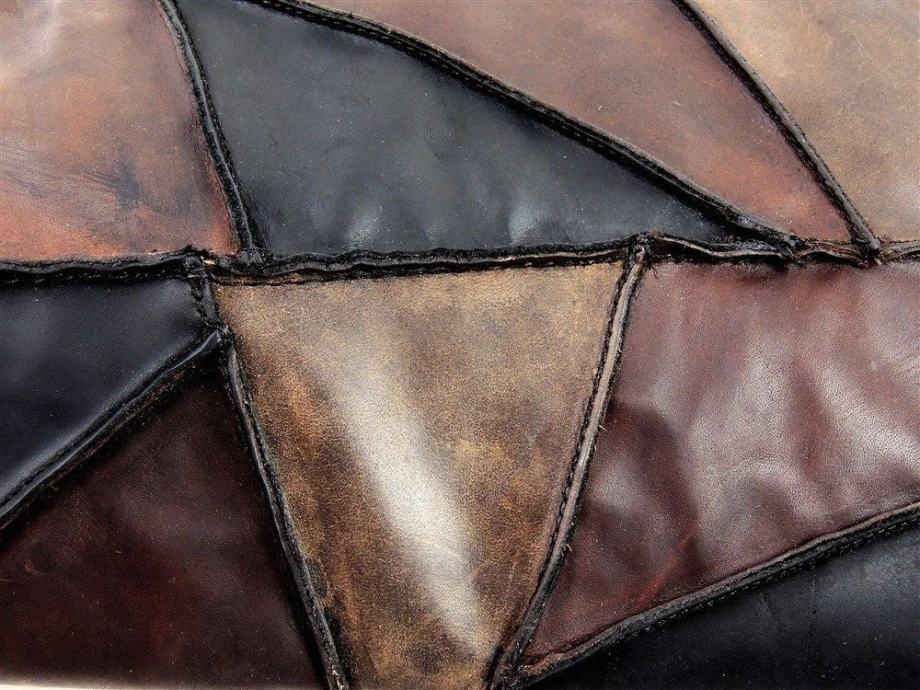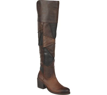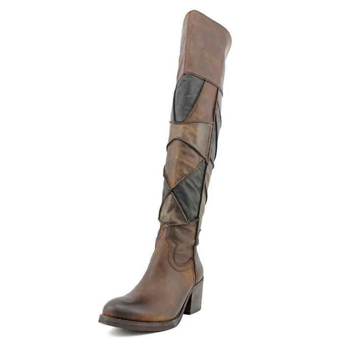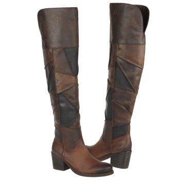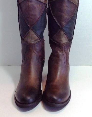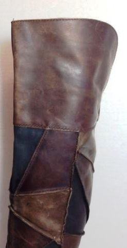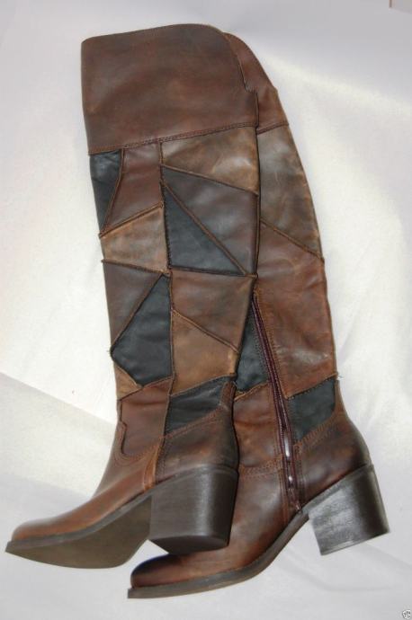 CARLOS SANTANA Locomotive, visoke, PREKO KOLJENA, smeđe čizme od iznimno kvalitetne kože, kupljene u Americi, od rombova kože različitih nijansi smeđe, spojenih kao mozaik ili patchwork, kao jahače, čizme na nisku petu, s malim neprimjetnim zatvaračem (ciferšlusom) s unutrašnje strane gležnja.