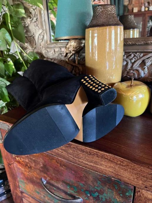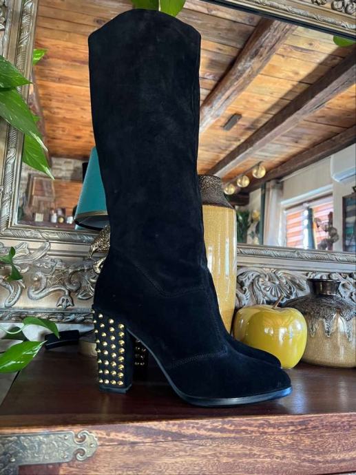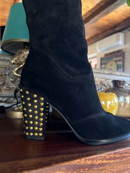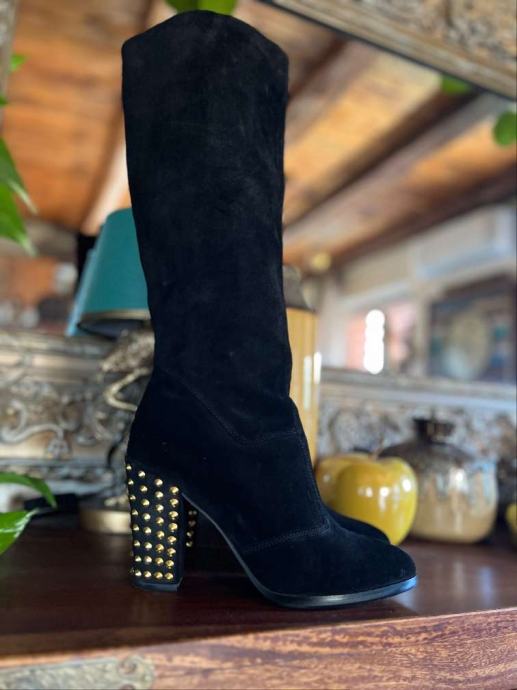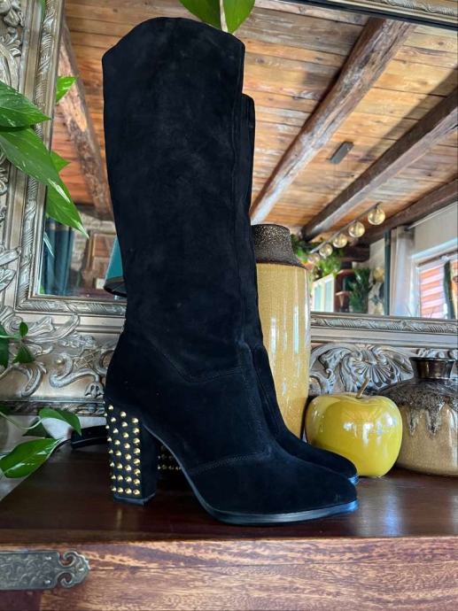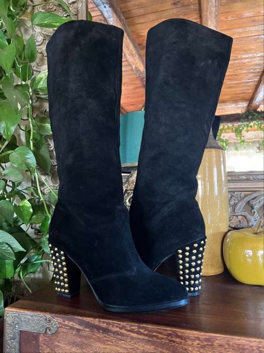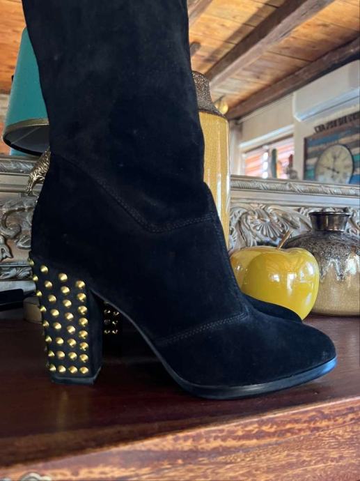 Moderne crne čizme do koljena od brušene kože sa zlatnim klinovima na peti