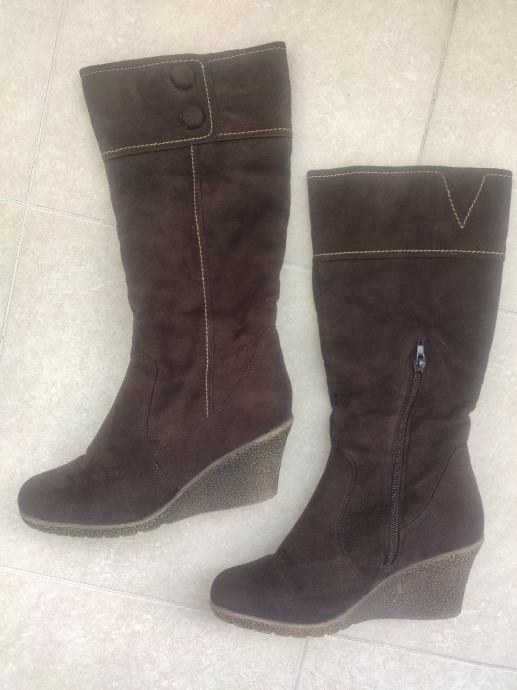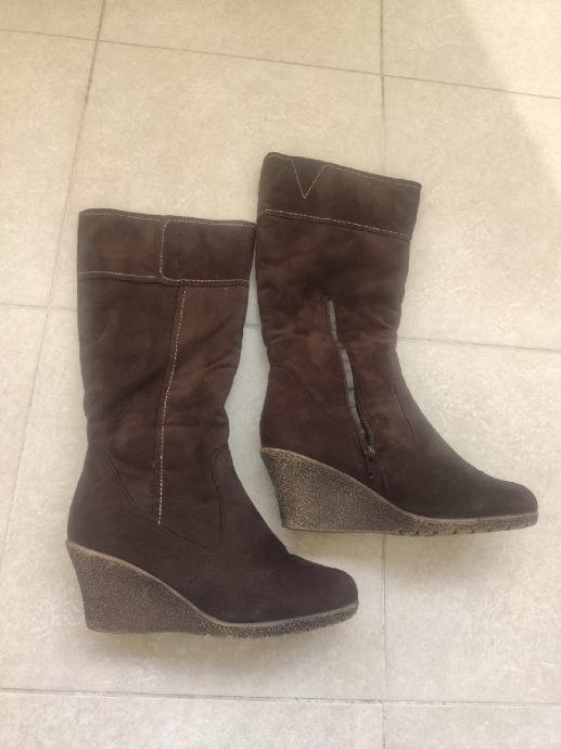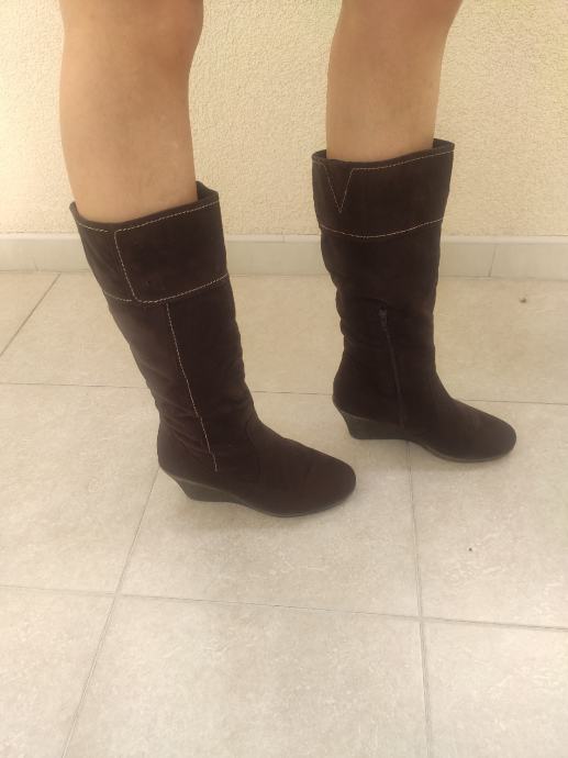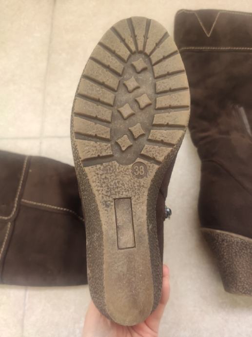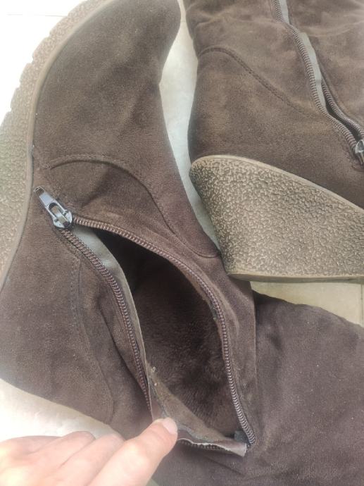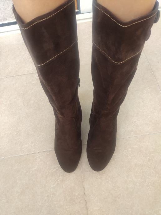 Prodajem smeđe čizme broj 38 od brušene kože. Malo nošene i dobro očuvane. Na jednom paru su otpali smeđi dugmi ali nije jako primjetno. Druga slika, lijeva čizma na vrhu. Iznutra su tople i vrlo ugodne. Visina potpetice 7 cm