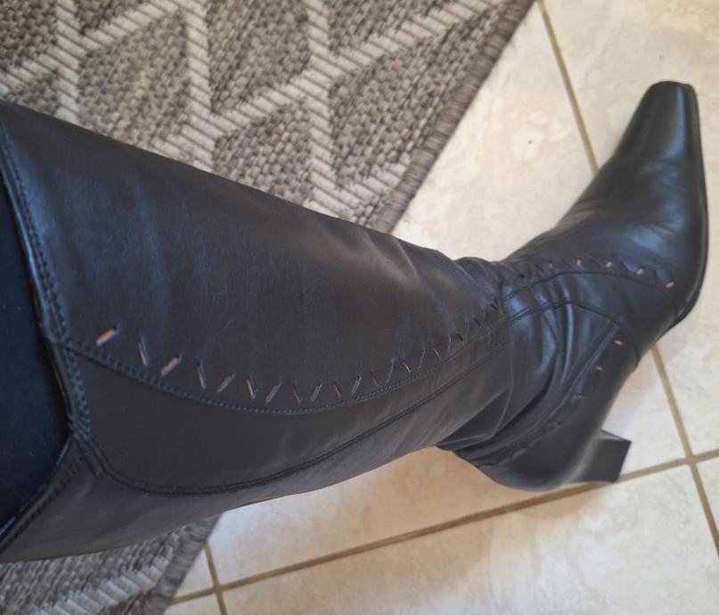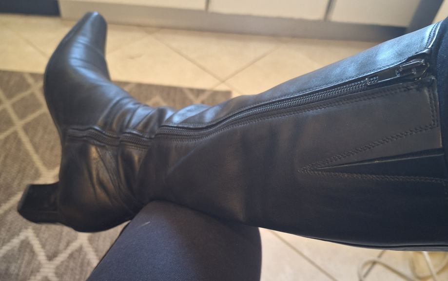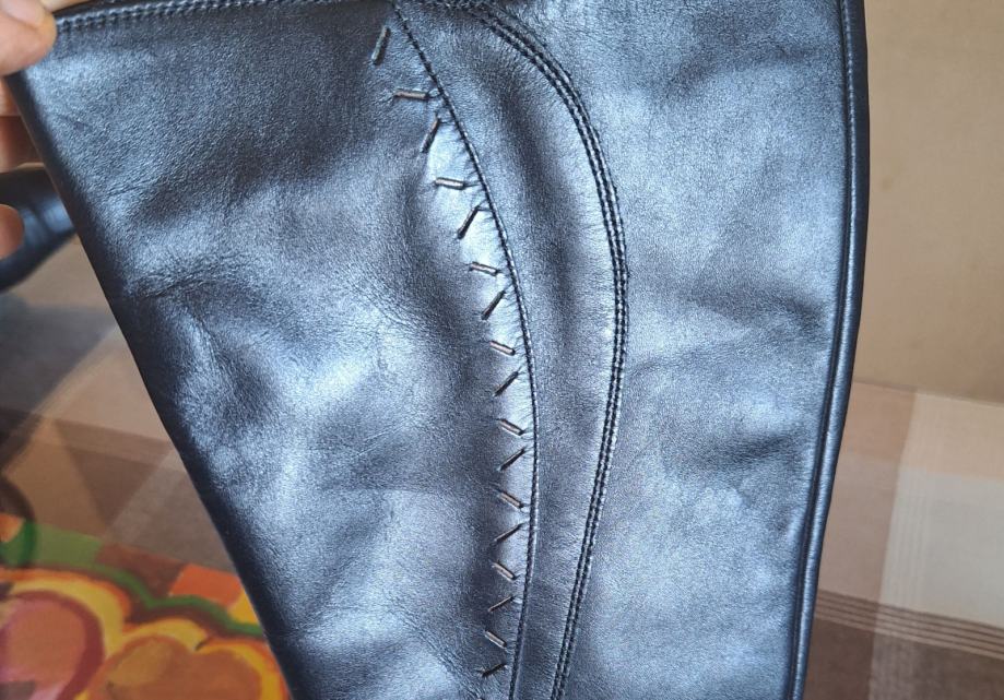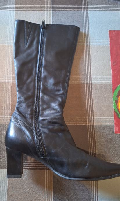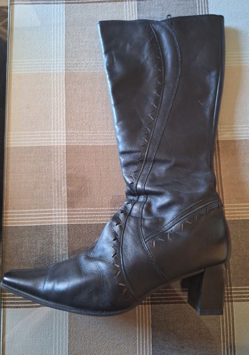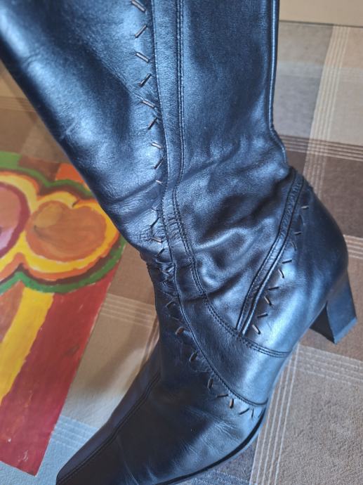 Prodajem kožne ženske čizme broj 39. Čizme su kupljene u Alpini i vrlo malo nošene tako da su u odličnom stanju i uščuvane. Čizme su uz nogu i na petu tako da su prikladne za nošenje na haljine i suknje. Visina pete je 6 cm, a ukupna visina čizme (s petom) 40 cm. S unutarnje strane svake čizme je mali prorez s lastikom kako bi se čizma razvukla za osobe koje imaju deblje listove.