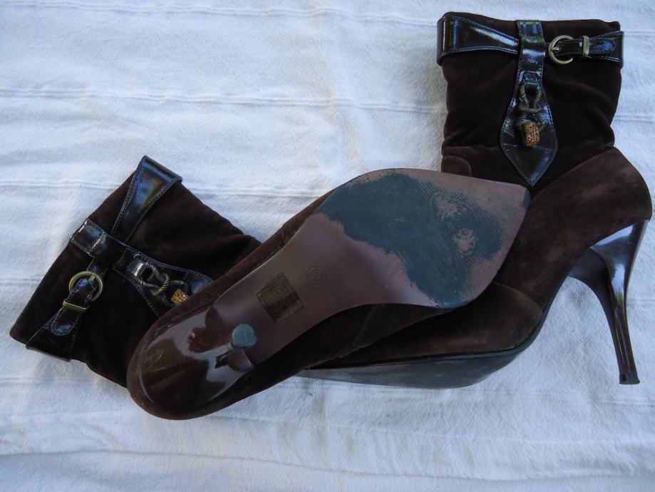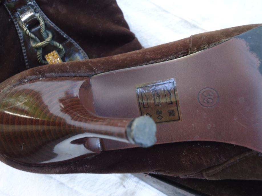 Smeđe plišane čizme sa visokom petom (9 cm). Nošene što se jedino vidi na đonu koji je djelomično izgubio smeđu boju.