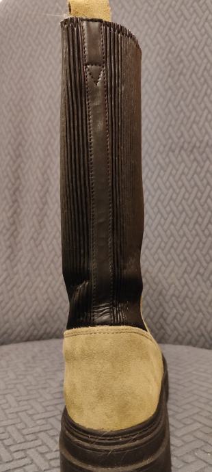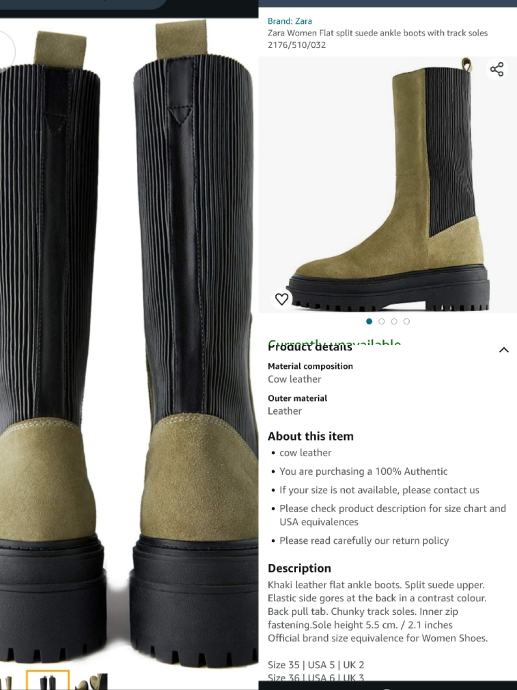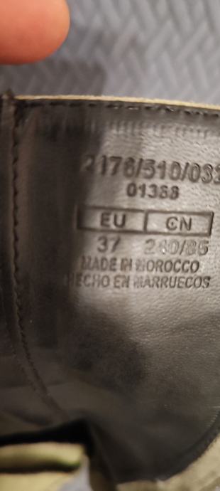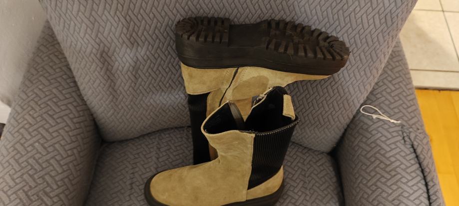 Obuvene 2-3puta, kožne/ brušena koža.Boja matirana- svijetlozelene masline , neklizajući gumeni đon.*harmonika* umetak straga je rastezljiv Unutarnje gazište 24 cm .Posljednja fotografija sa specifikacijama je s interneta. Cijena je s troškovima slanja.