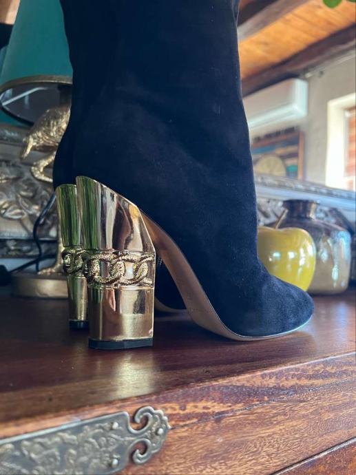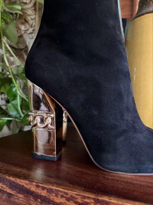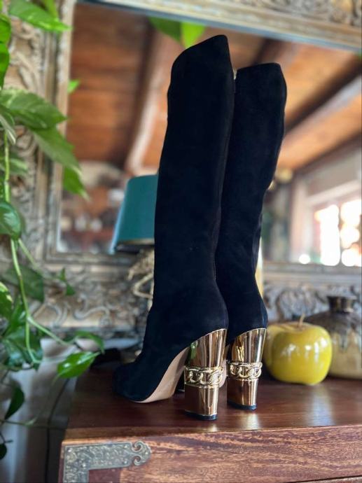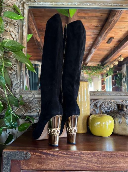Casadei dizajnerske čizme od crne brušene kože sa zlatnom, skulpturalnom petom.