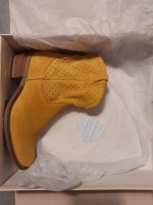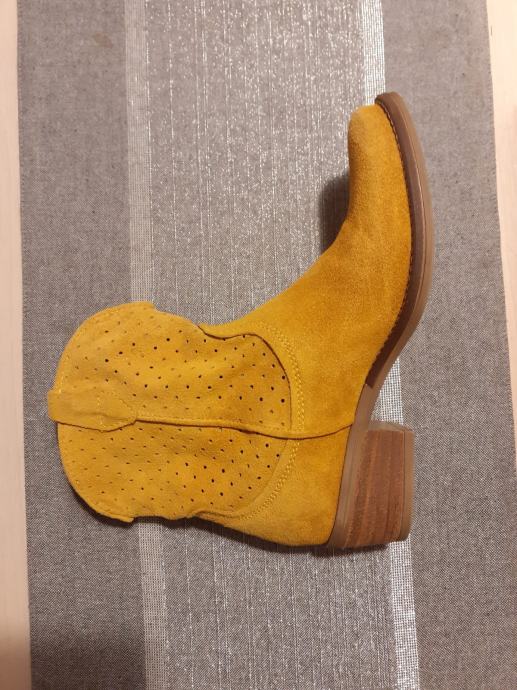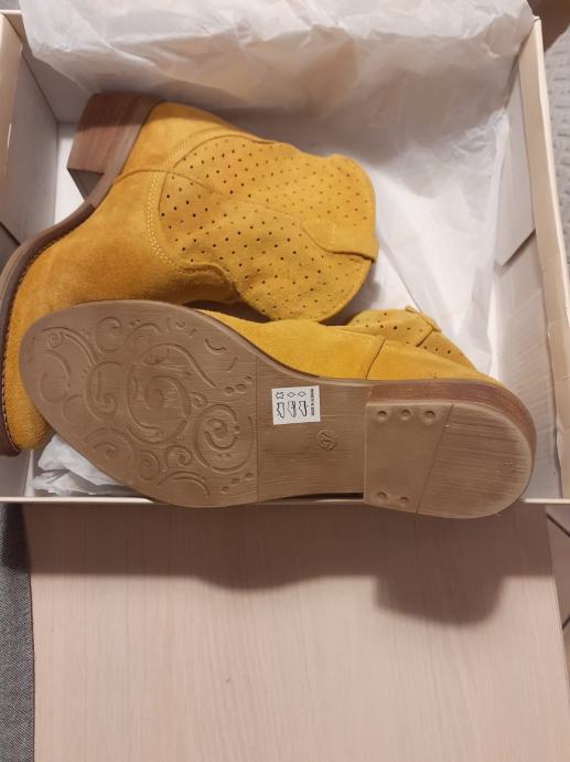 Elegantne ženske kožne čizmice u živahnoj žutoj boji, potpuno nove s etiketom. Veličina 37, izrađene od kvalitetne kože s atraktivnim perforiranim detaljima za dodatni stil.