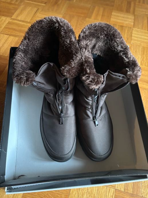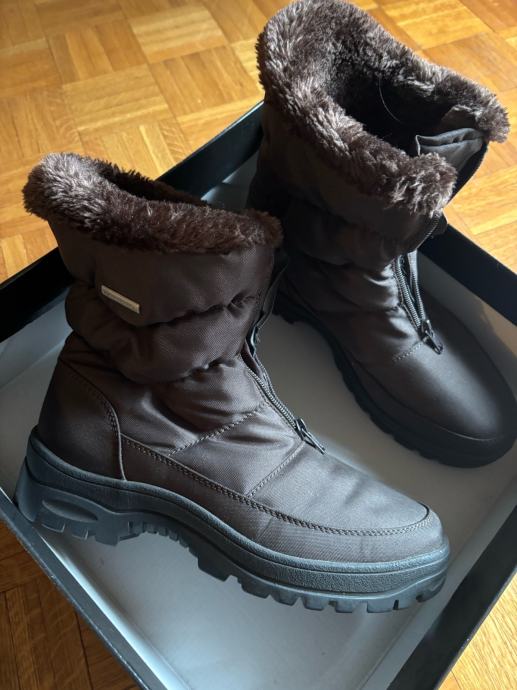 Prodajem kvalitetne ženske čizme za snijeg smeđe boje, veličine 40, s protukliznim potplatom. Čizme imaju ugodnu nisku petu od 2 cm i toplo krzno iznutra za maksimalnu udobnost tijekom hladnih dana. Jednom nošene, idealne za zimske uvjete i sigurno hodanje po zaleđenim površinama.