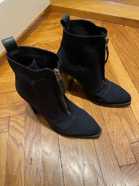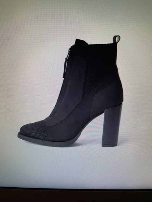 Visoka peta (9 cm), materijal: tekstil + koža. Broj 36, malo veći model. Stil: poslovna sportska elegancija.
