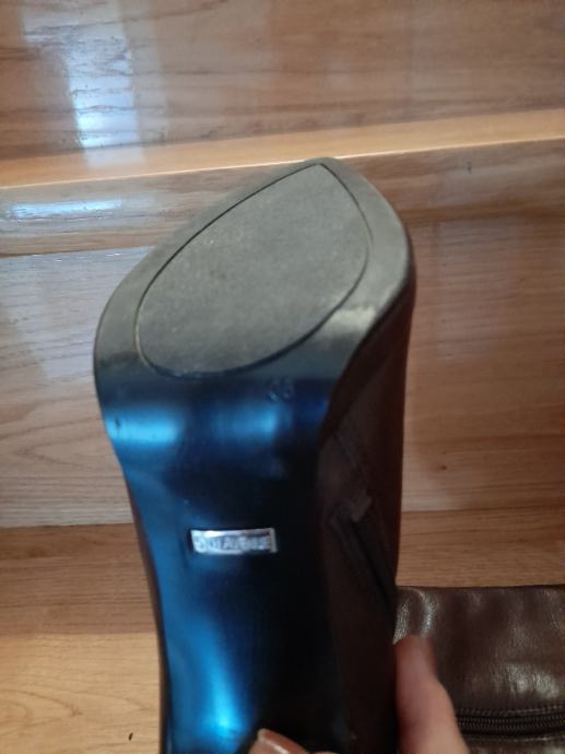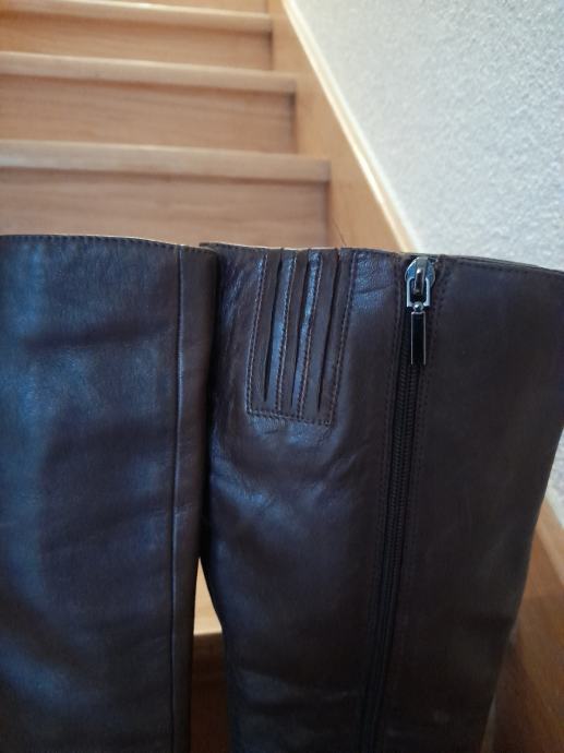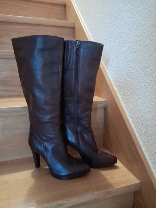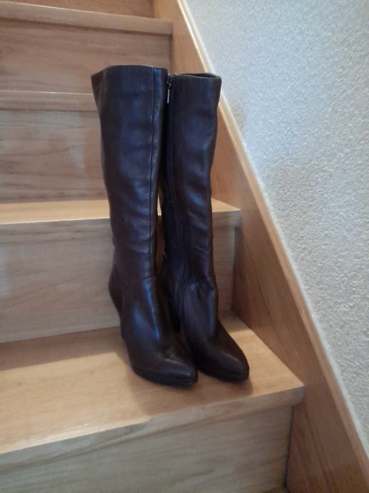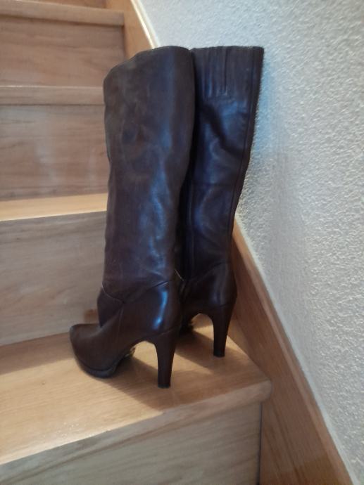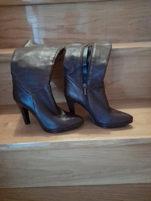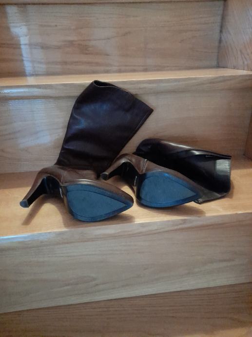 Prodajem visoke zenske kozne cizme, kratko nosene, tamno smede boje, elegantne velicina 36.Visina pete je 9,5 cm. Cijena 10 € .Informacije na tel 035 260 202