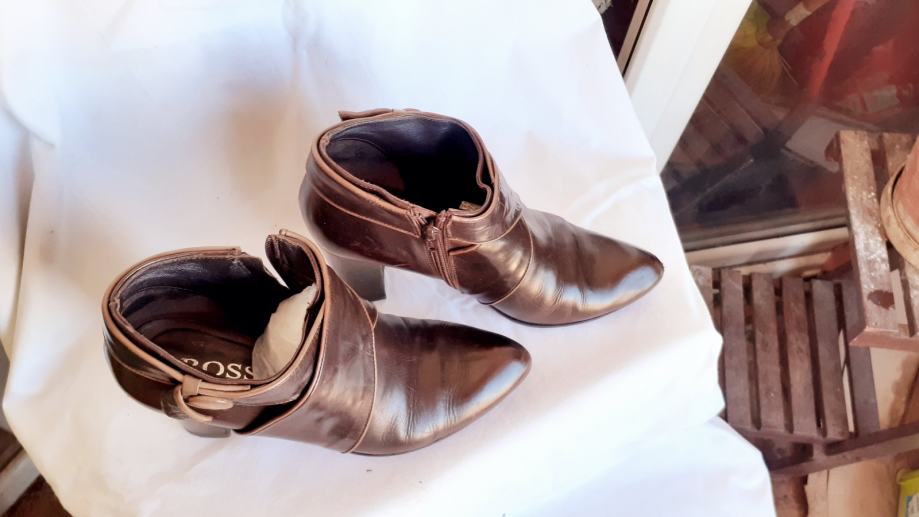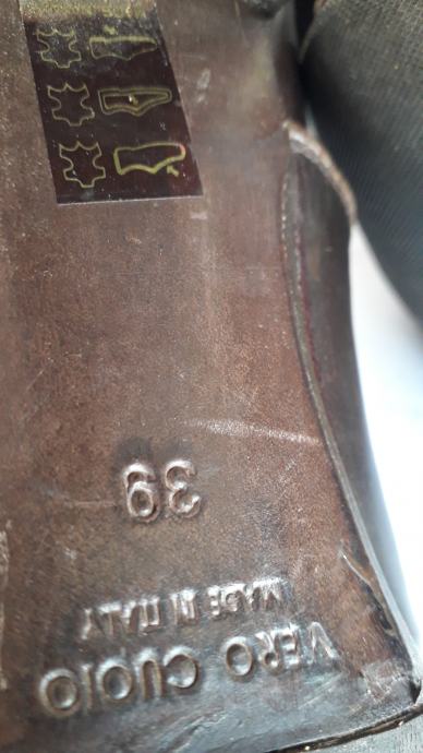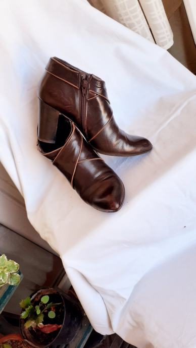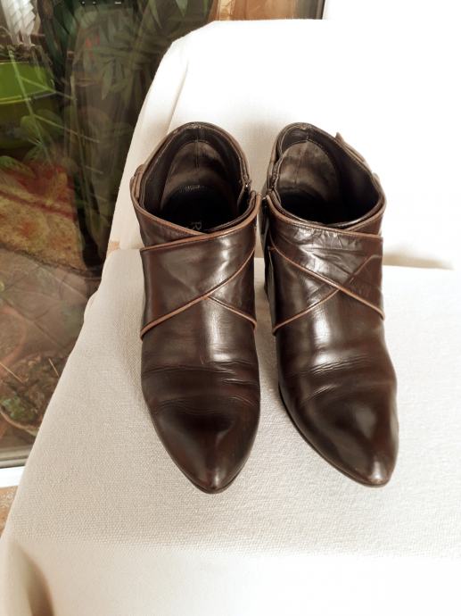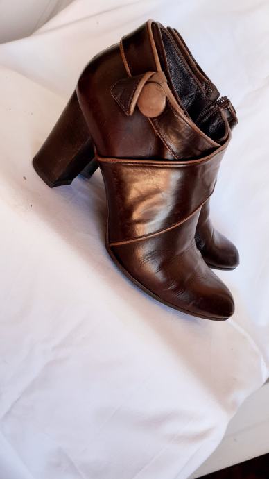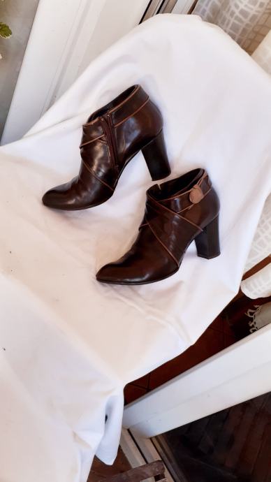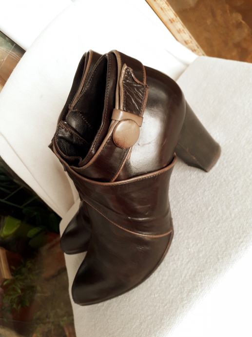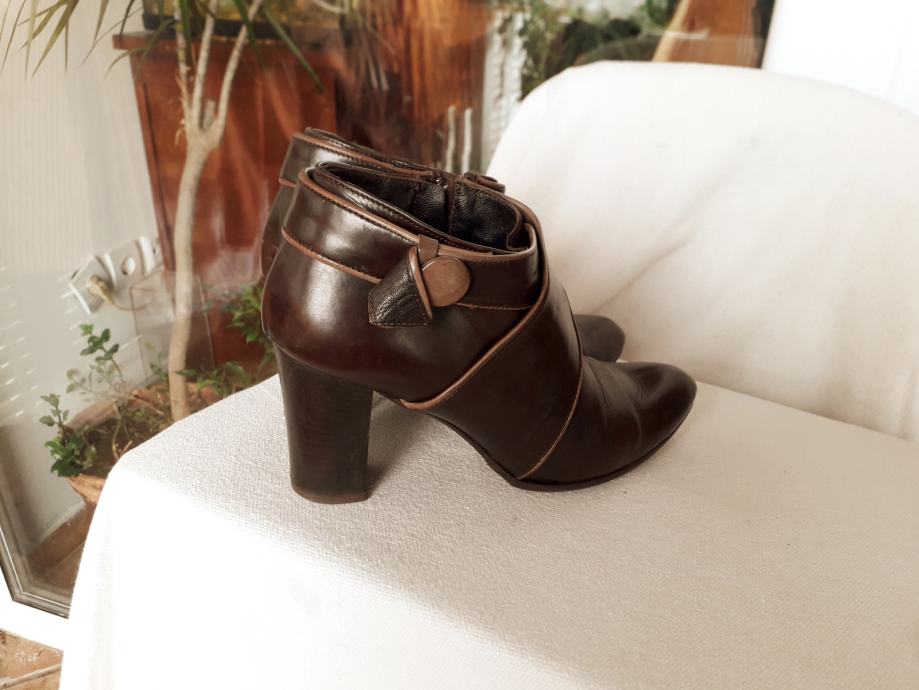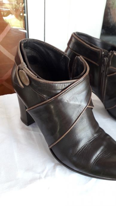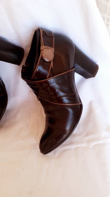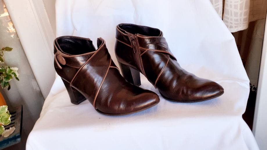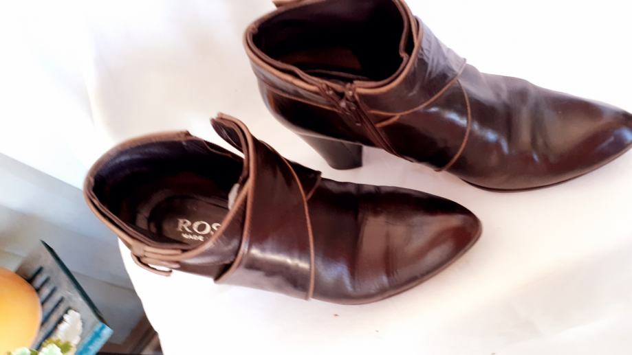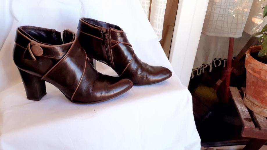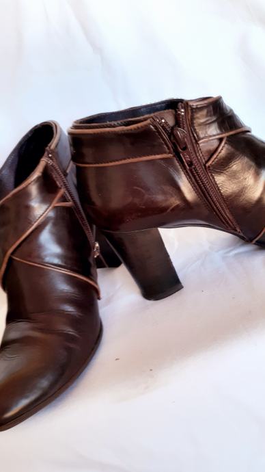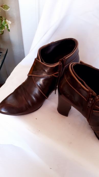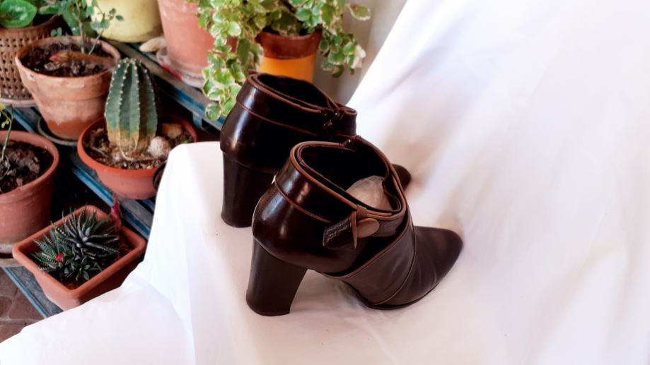 Kao nove, bez greške, od prave mekane kože, talijanske proizvodnje, visina pete 11 cm. Veoma udobne, lagane, kopčanje na patent, vrlo malo nošene, bez ijednog oštećenja. Lijepe tamnosmeđe, čokoladne boje, obrubi u krem boji, još dugo nosive. Prava talijanska kvaliteta cipela. Dužina gazišta iznutra 25 cm, klasičan komotan broj 39.