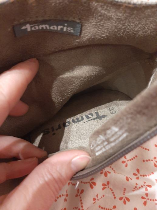 Potpuno kožne ( kombinacija sa velur kožom) izvana i iznuta ženske nove, nikad nošene čizmice Tamaris. Na sari sa umetkom od gume za regulaciju širine sare. Vel. 39. Visina pete 8cm.
