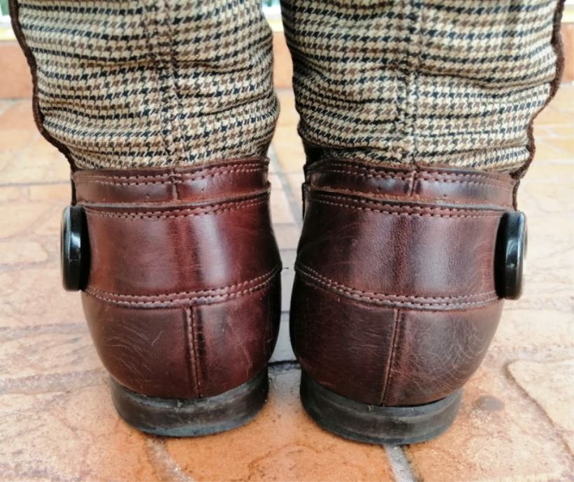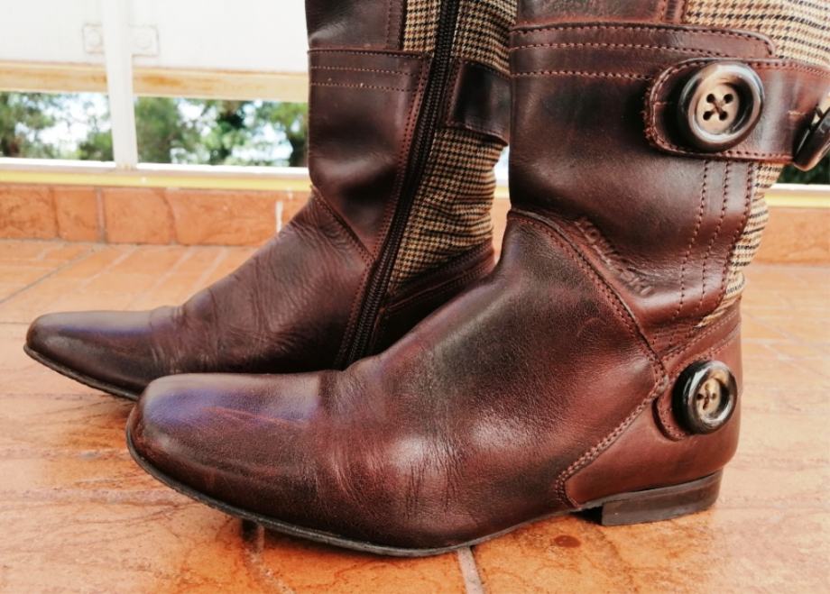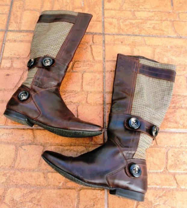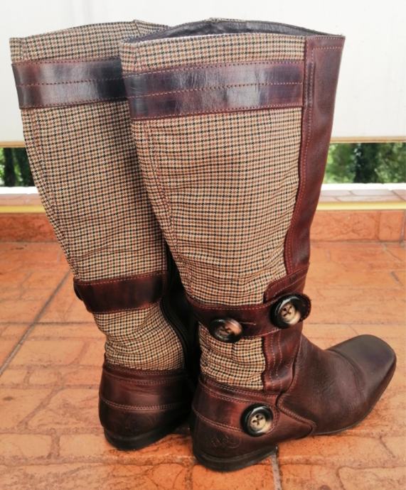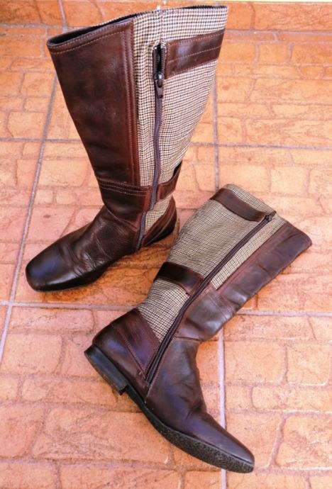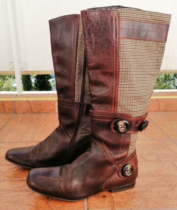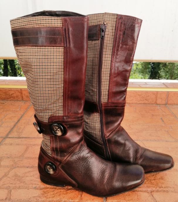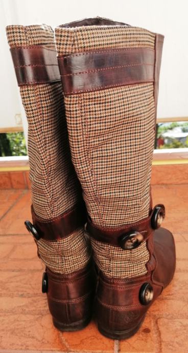 Predivne smeđe kožne čizme s kariranim detaljima.