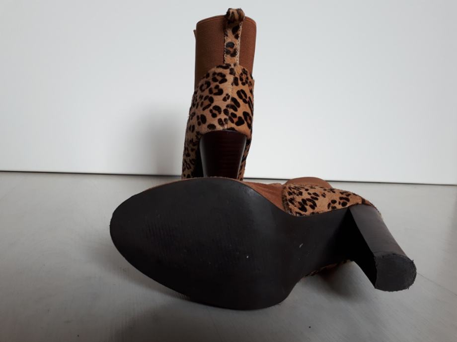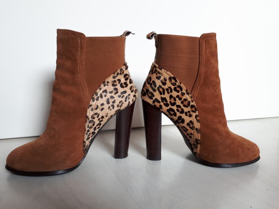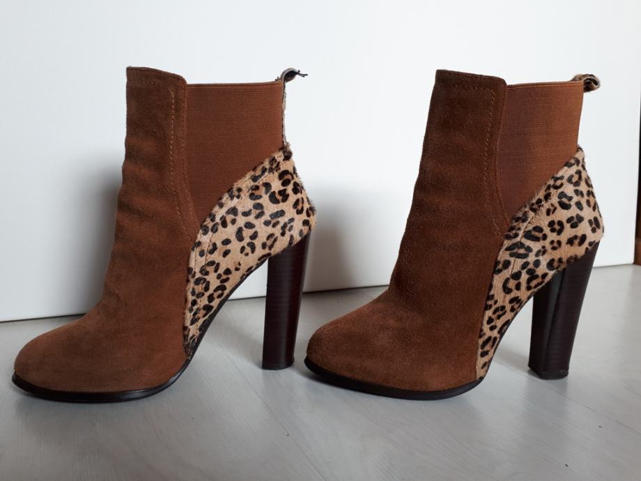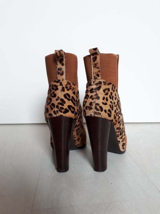 KOŽNE ČIZMICE br.37 , kombinacija svijetlo smeđe brušene kože i dlakave kože , uzorak leoparda , visina pete 11 cm , par puta nošene.