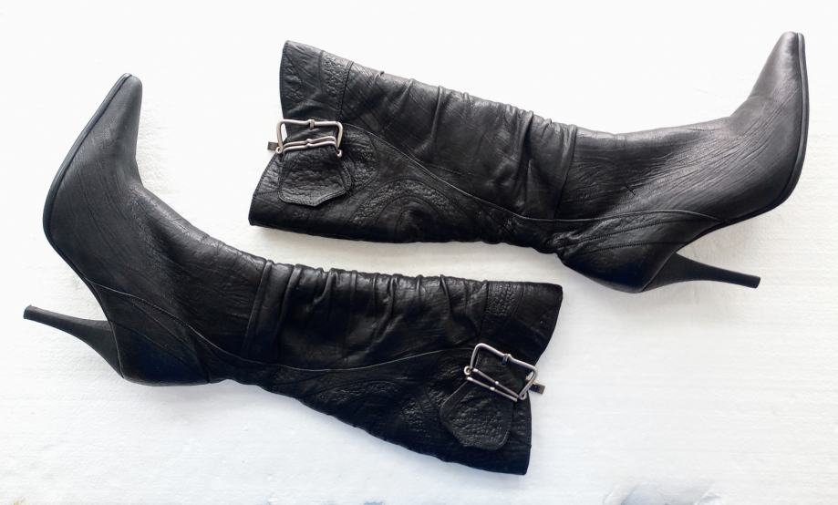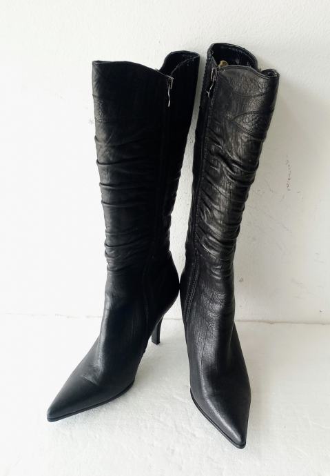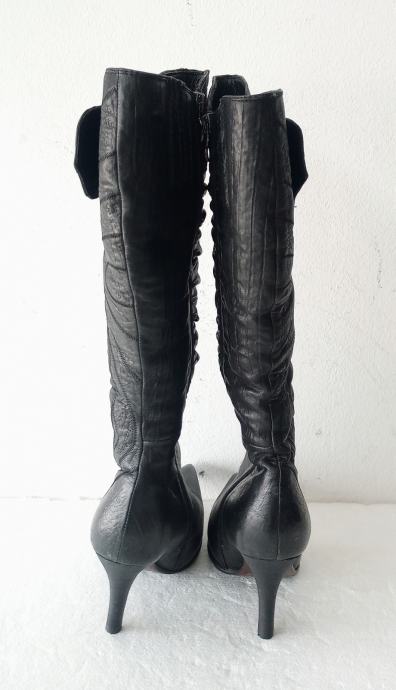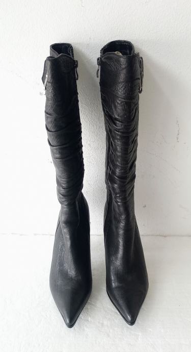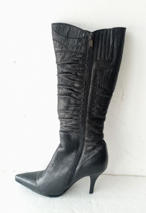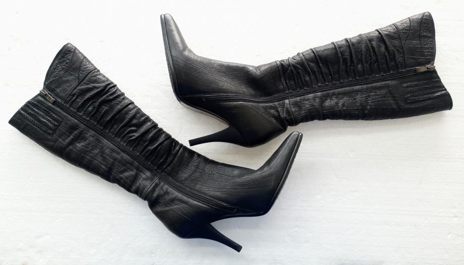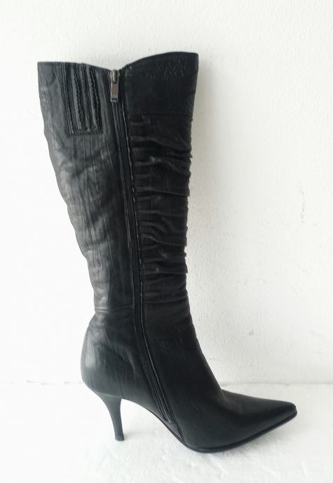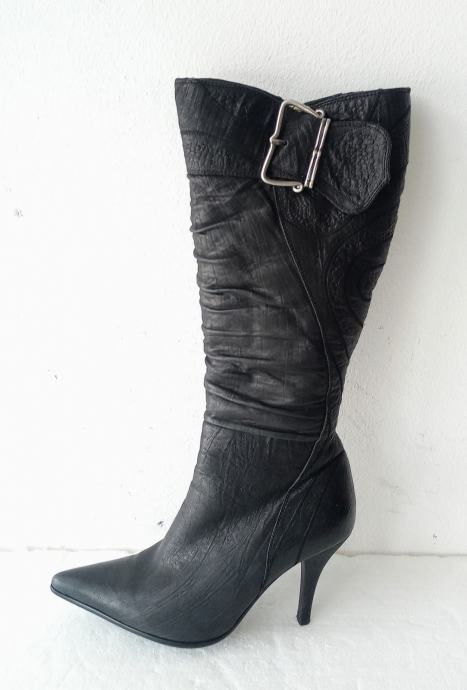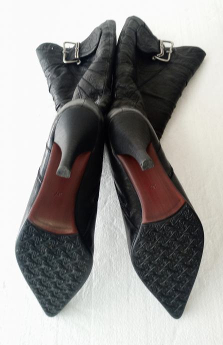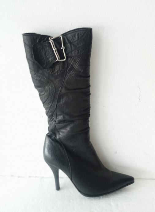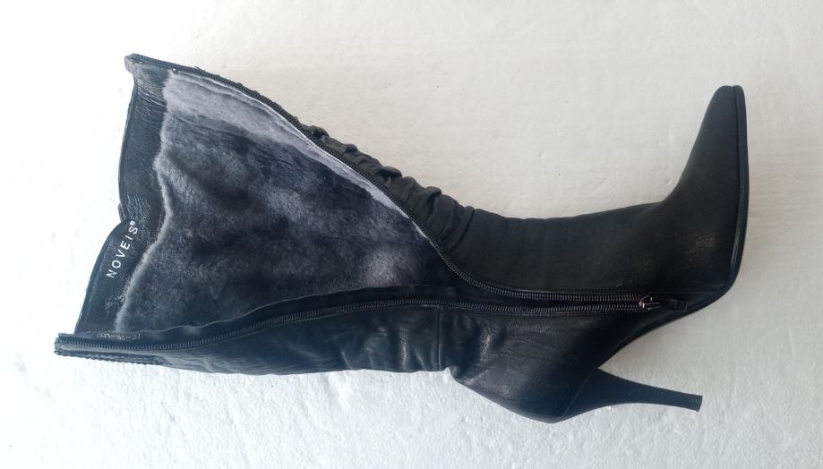 NOVEIS crne špic čizme na visoku petu. Deklarirana veličina je 37, ali su zbog krzna i špica broj manje. Izvana prirodna koža, iznutra deblji sloj umjetnog krzna. Sa vanjske strane sare ukrasna metalna kopča. Opseg sare na najširem dijelu je 35 cm. Visina sare mjerena bez pete je 36 cm. Visina pete je 9 cm.