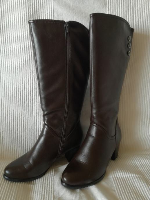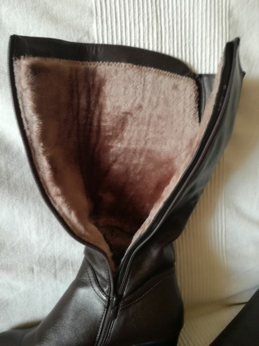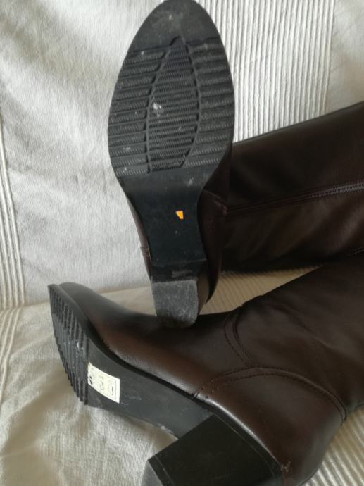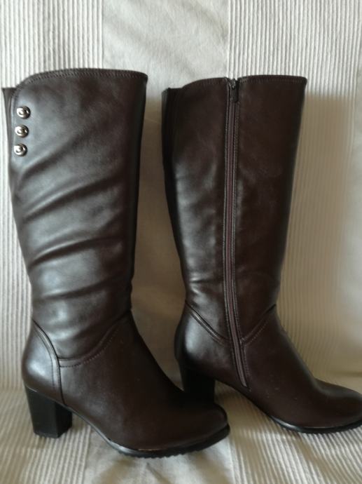 Nove smeđe ženske čizme, veličina 38, unutrašnjost postavljena krznom. Unutrašnje stopalo 24 cm, peta 6,5 cm, Sara visine 35 a širine 19 cm. Neklizajuća potplata.