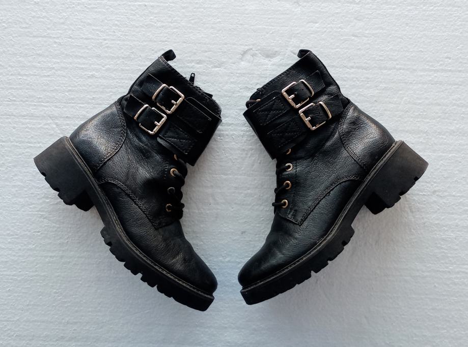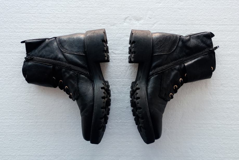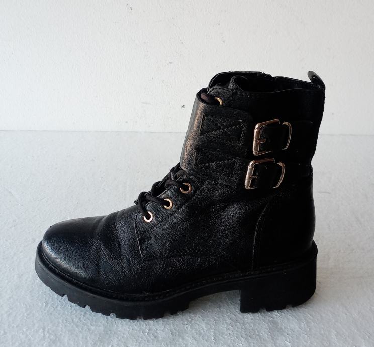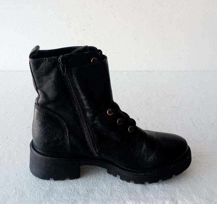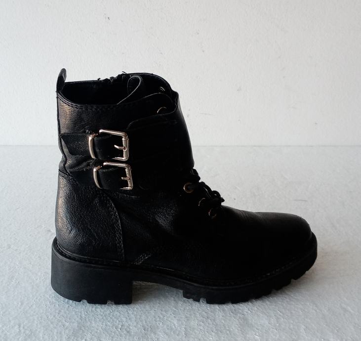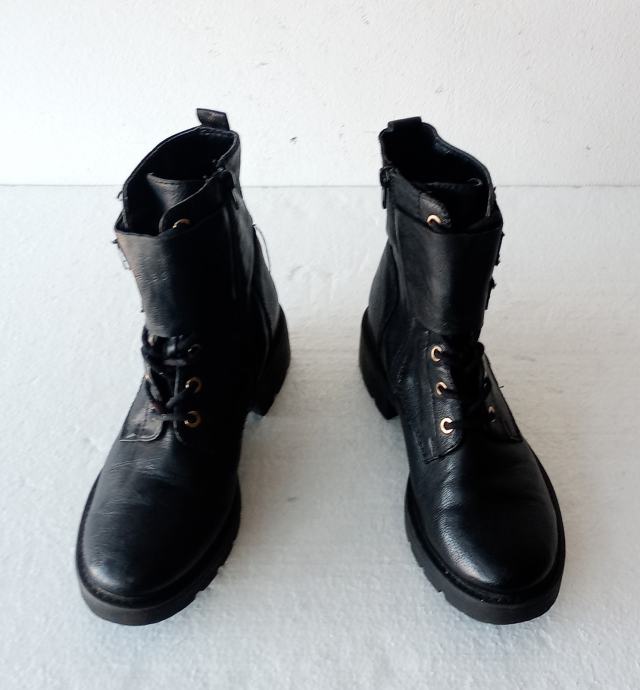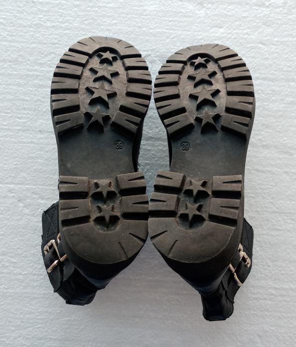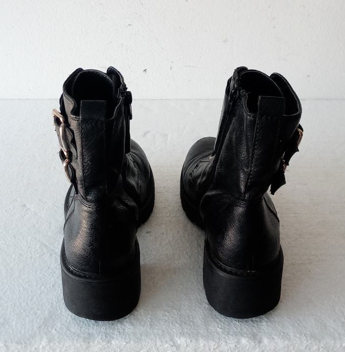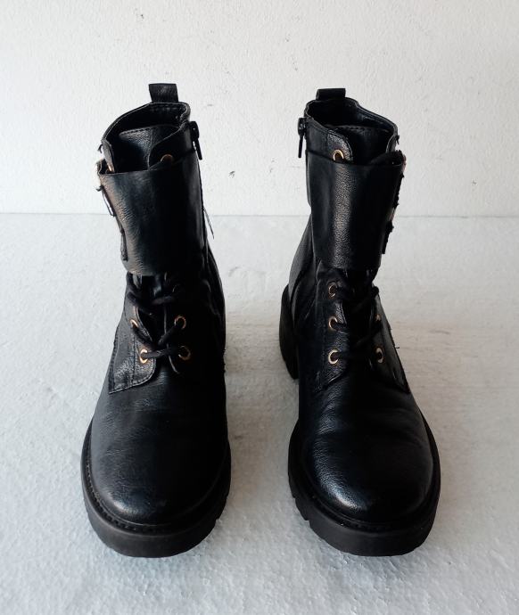 STAR COLLECTION kraće čizmice. Deklarirana veličina 39 (unutarnje gazište 25,5 cm). Gornjište od kvalitetne imitacije kože crne boje. Zatvaranje na dva načina, vezanje vezicama kroz niz od 7 rupica (preko je remen sa dvije metalne kopče zlataste boje) i sa strane je zip. Visina široke pete je 4,5 cm. Nošene jedan put, prodaju se zbog viška u tom tipu gležnjača.