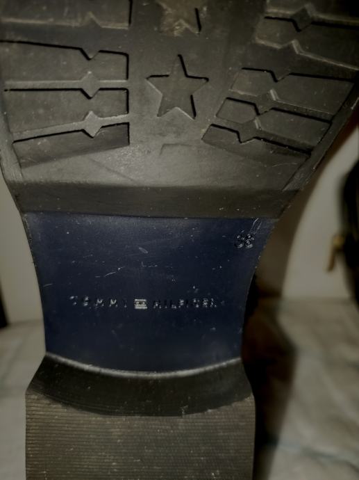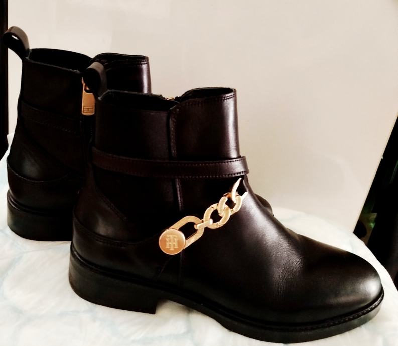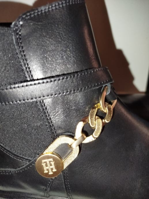 Elegantne Tommy Hilfiger Chelsea čizme od prave kože u crnoj boji, veličine 38, potpuno nove bez etikete. Izrađene su bez pete za maksimalnu udobnost tijekom nošenja, a zlatni detalji daju im sofisticiran izgled.