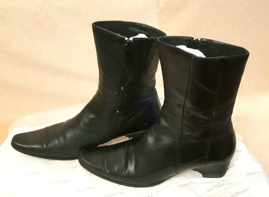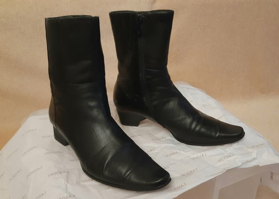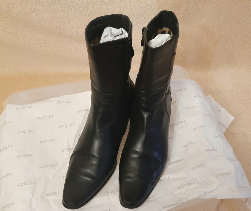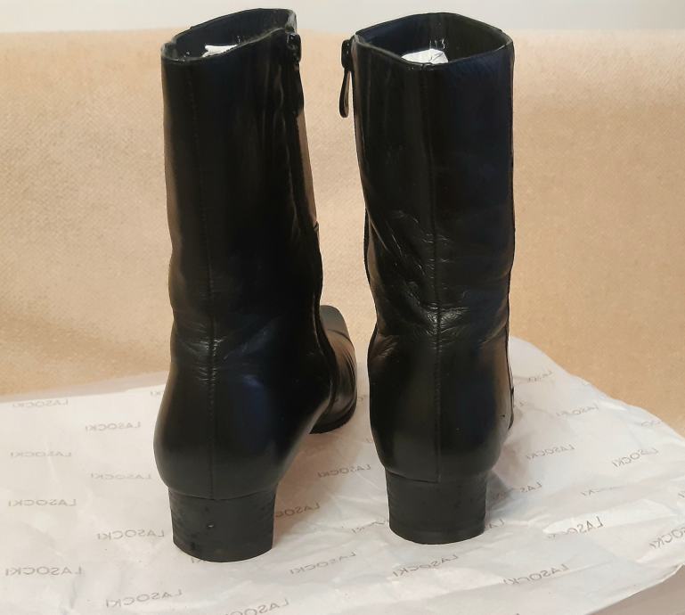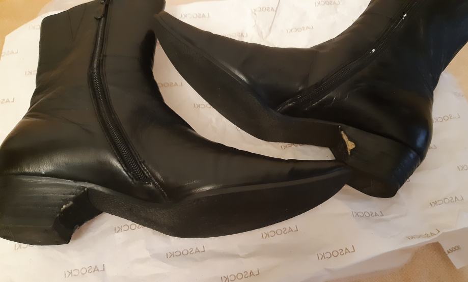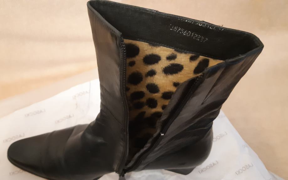 Tople crne niske čizme, gležnjače, vel. 38 , s krznenom podstavom leopard uzorka. Nošene jako malo, izgledaju i jesu u odličnom stanju, osim na peti gdje je oštećenje, koje može popraviti svaki postolar. Nisu popravljene zato jer stoje nekorištene jer se vlasnici noga proširila pa su premale. Koža je teleći boks, vrhunske njemačke kvalitete. Drže kišu. Visine su 22 cm, a visina pete je 3 cm.