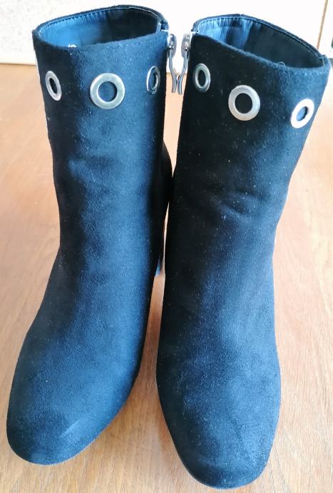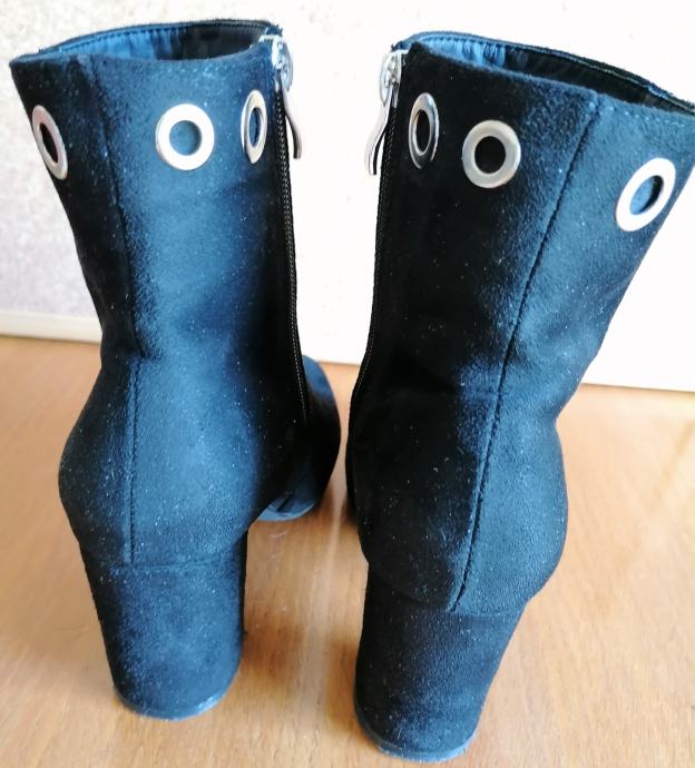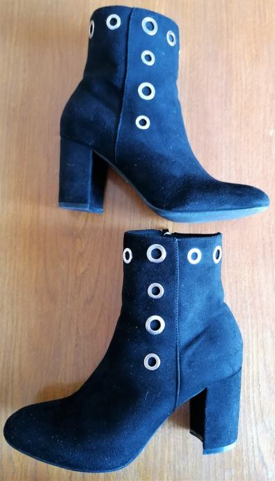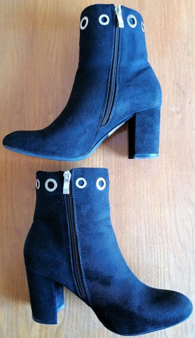 Čizme gležnjače na visoku petu, od velur tkanine, sa ukrasnim krom zakovicama, zatvaranje na zip.