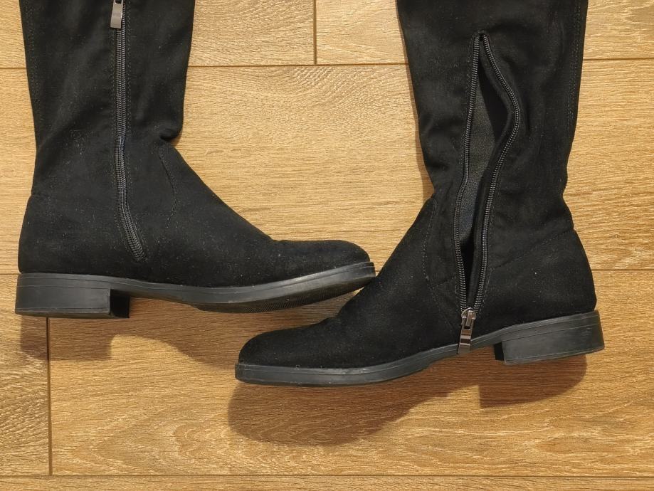 Prodajem crne visoke čizme do koljena, veličine 38. Izrađene su od rastezljivog materijala u imitaciji brušene kože, s niskom potpeticom i patentnim zatvaračem sa strane. Na vrhu imaju vezicu za podešavanje. Čizme su do koljena i prianjaju uz nogu. Odgovaraju i na manji br 39.