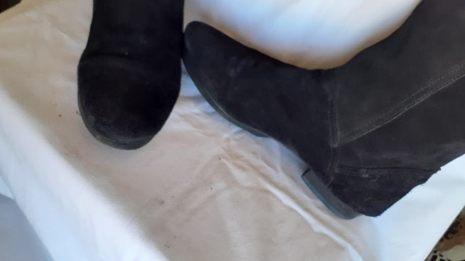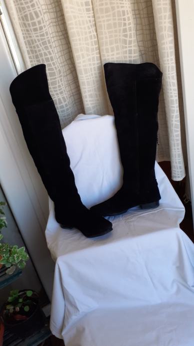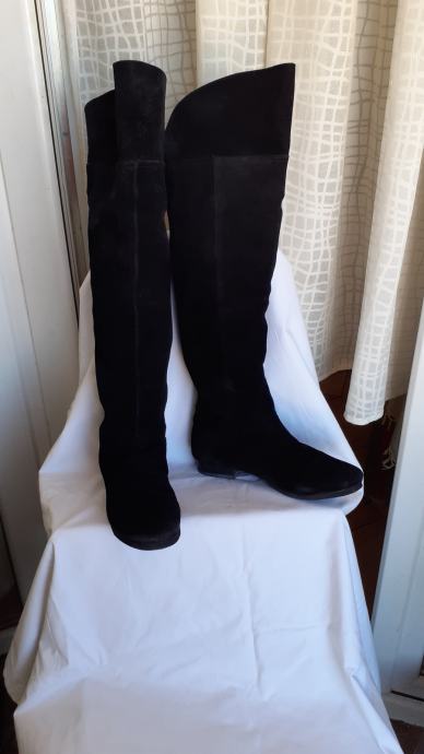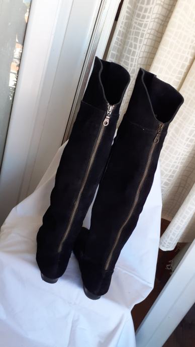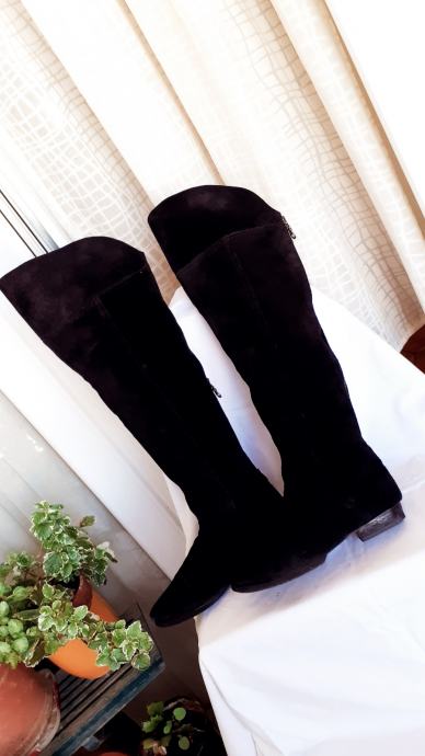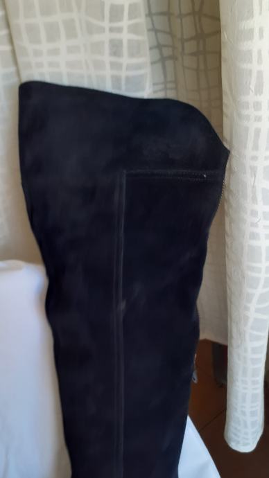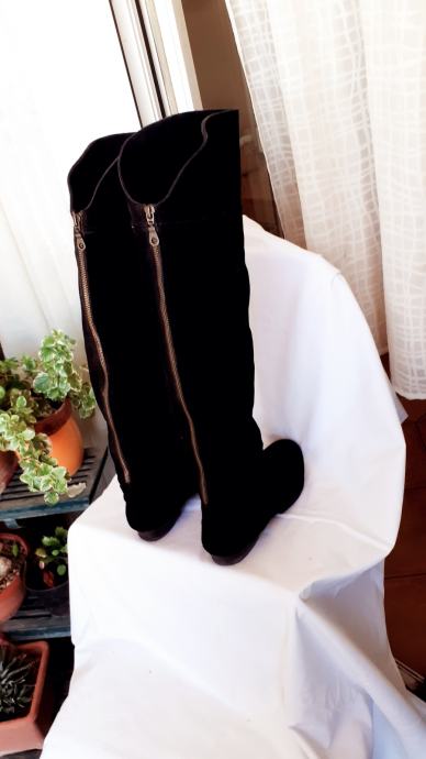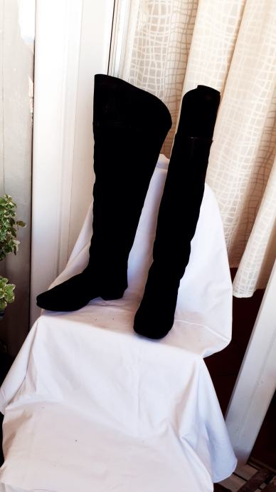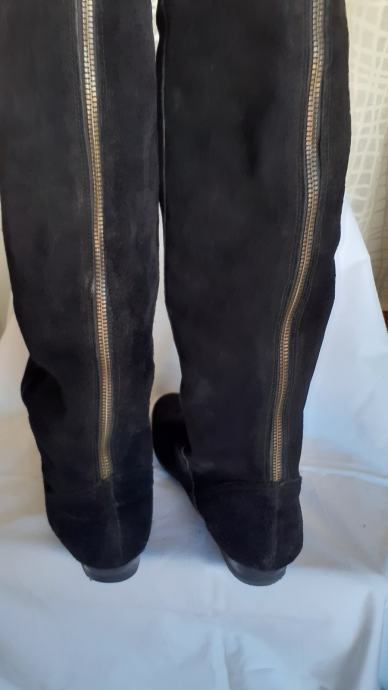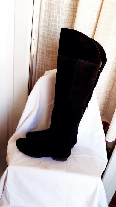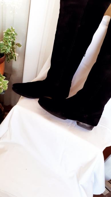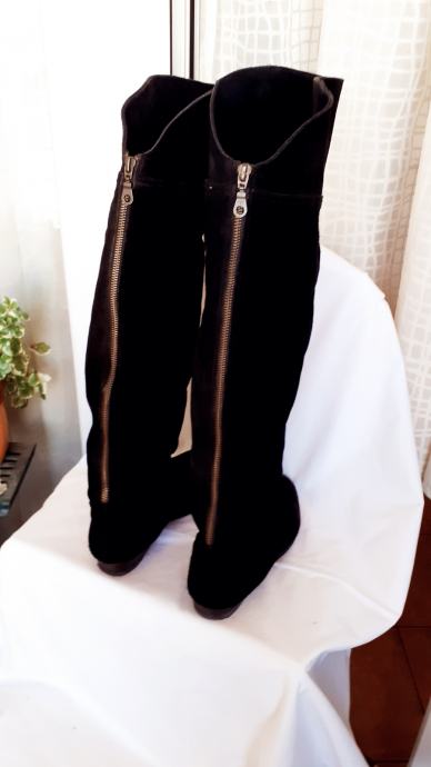 Kvalitetne visoke čizme za oko15 cm iznad koljena, od fine, mekane,prave brušene kože, ugodne i elegantne. Manji tragovi nošenja, specifični za pravu kožu, no još dugo nosive, kopčanje patentom iza po sredini. Dužina gazišta iznutra 25 cm, br.6, visina sare od ruba do vrha 47-57 cm, obujam sare na vrhu 40 cm. Potpuno očuvane, bez greške, prava koža iznutra i izvana, potplat je gumiran, podstavljene toplim materijalom. Jako udobne, tople i nepromočive. Komotan klasičan broj 39, pogodne za svaku nogu.