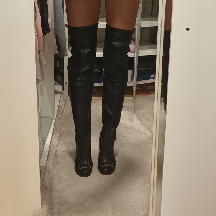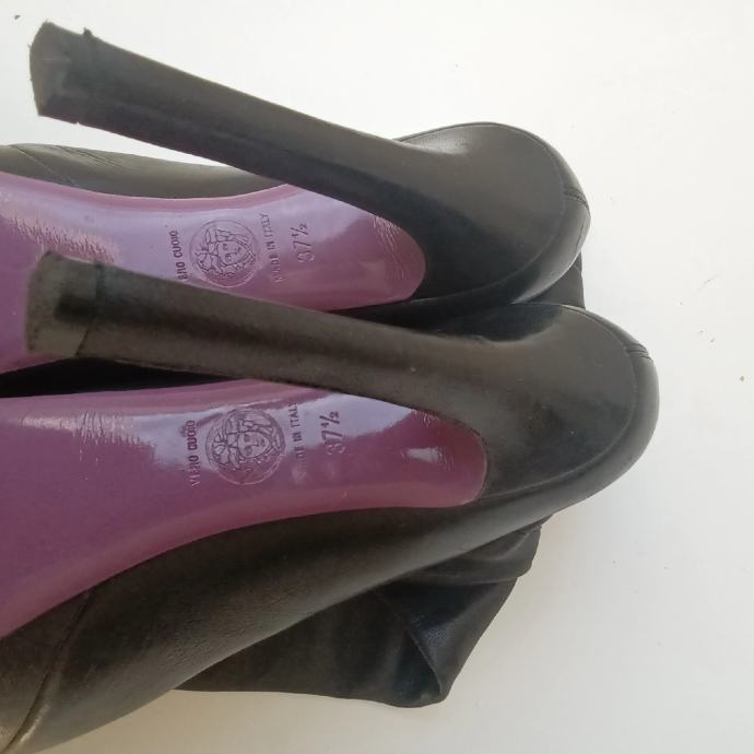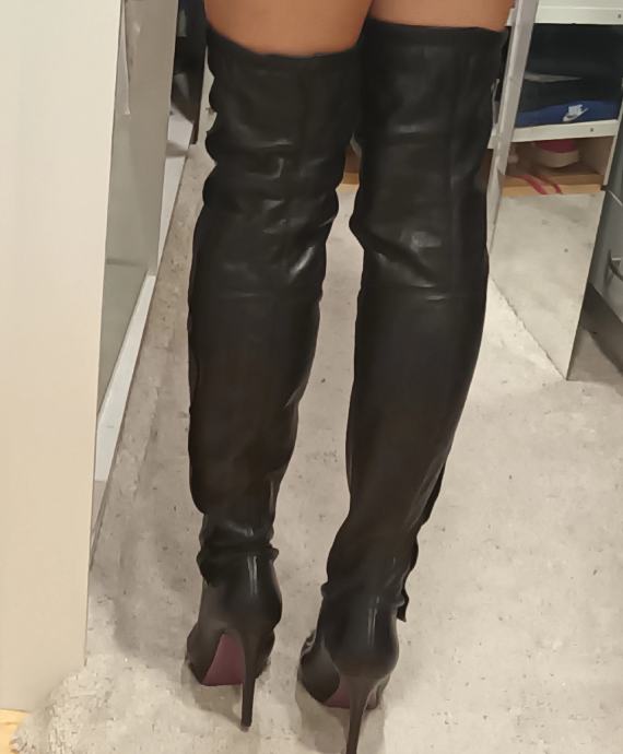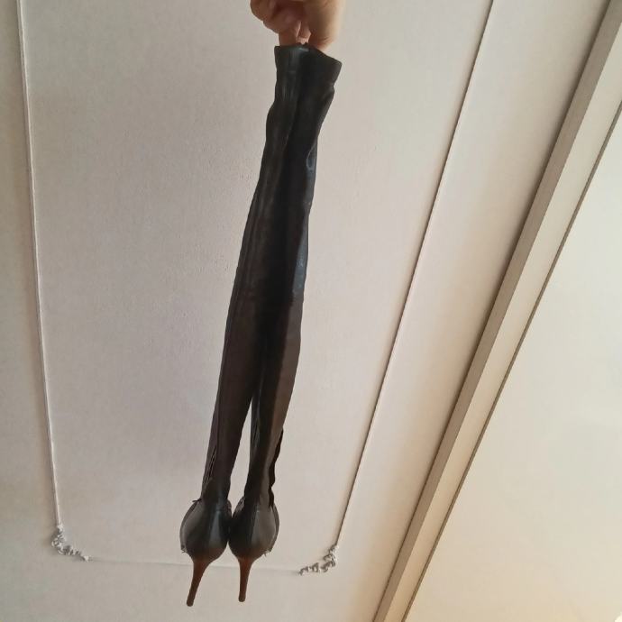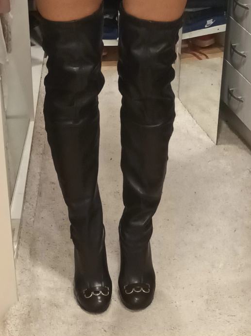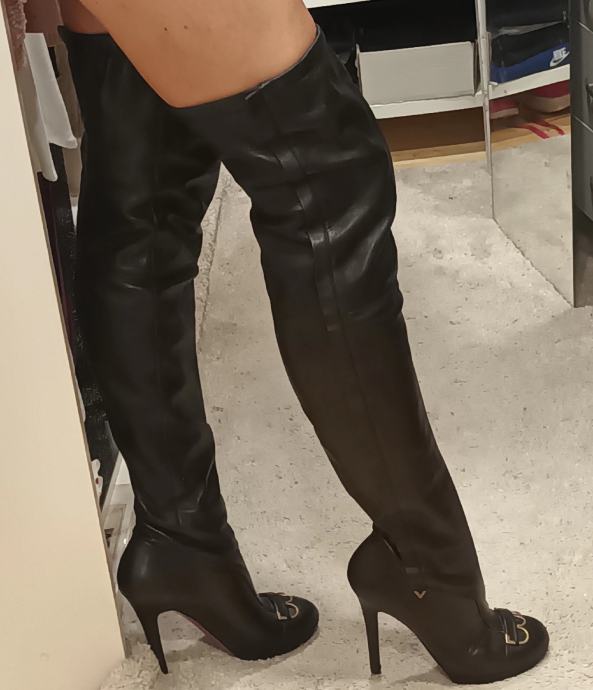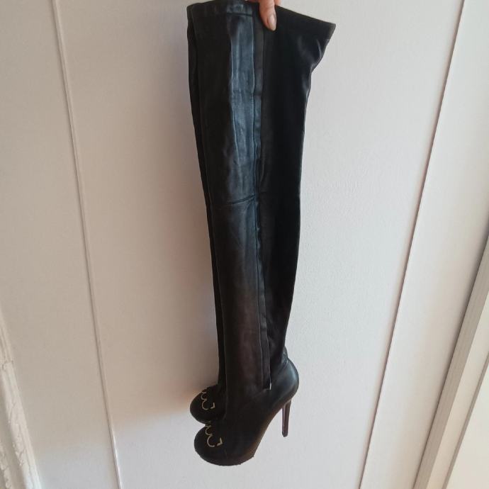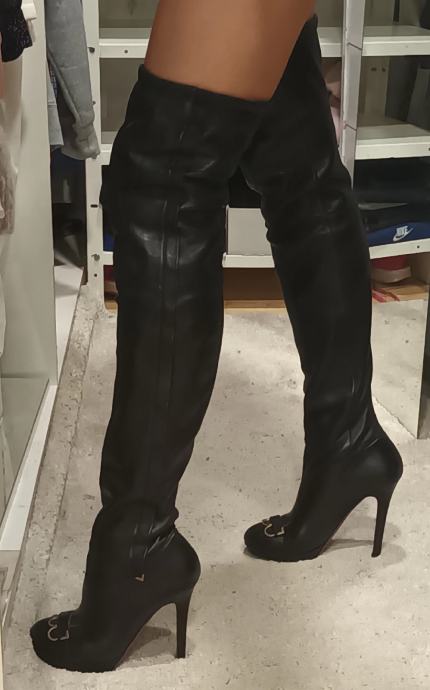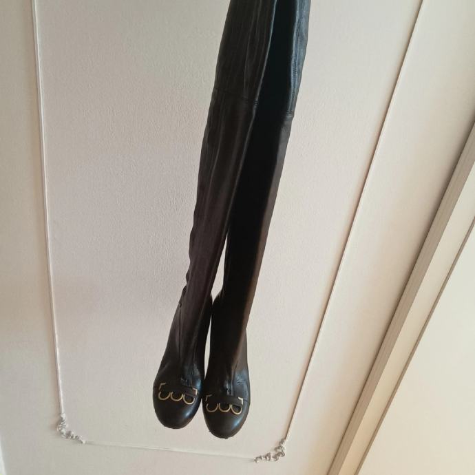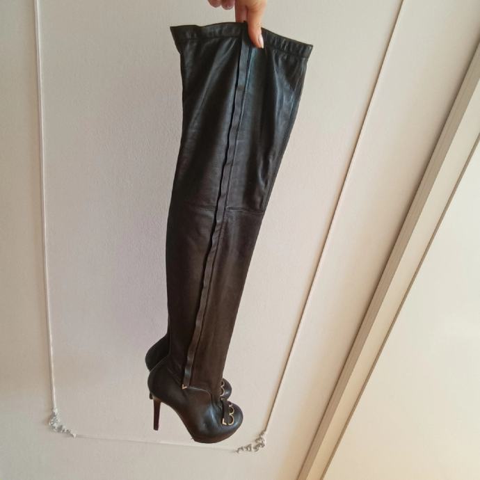 Visoke kožne čizme Versace 37 premeksna lamb skin koža, dugačke do bedara, iako visoka peta jako stabilne i preugodne jer nisu uzaludno toliko koštale već su izrađene od najkvalitetnije janjeće kože i konstrukcijski vrhunski izrađene, kupljene u švicarskoj, imam i račun