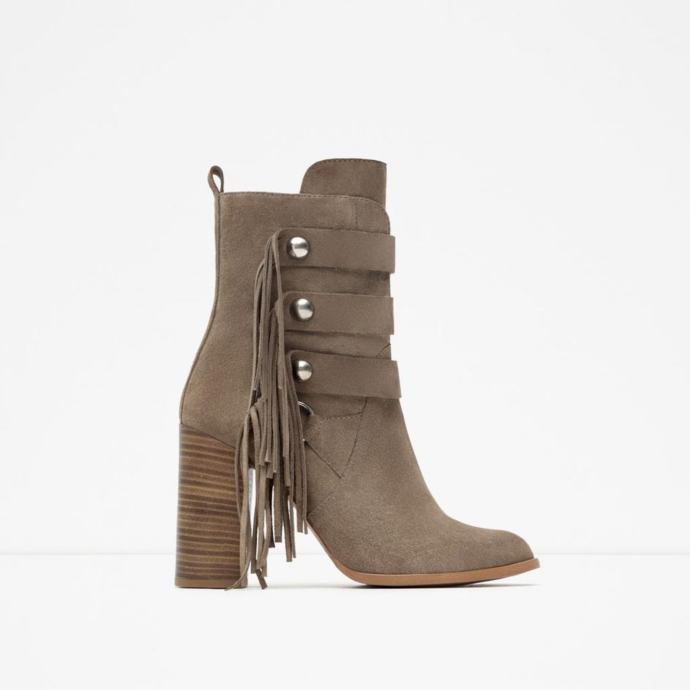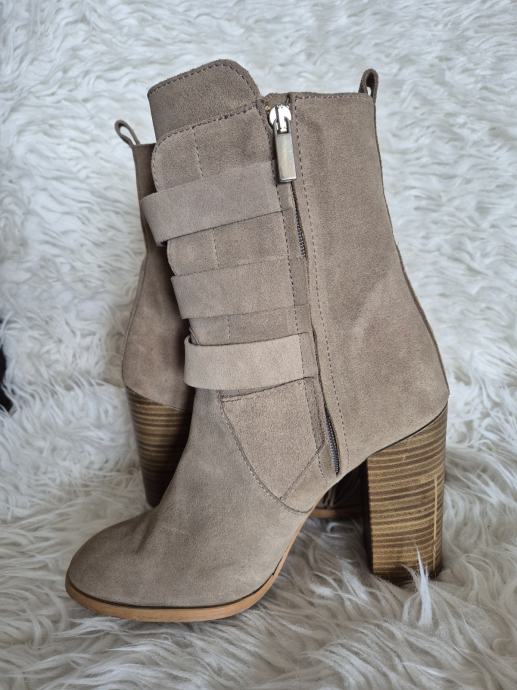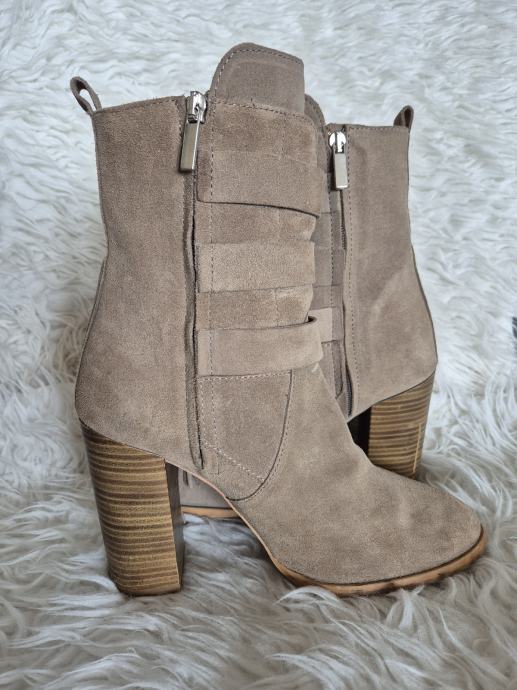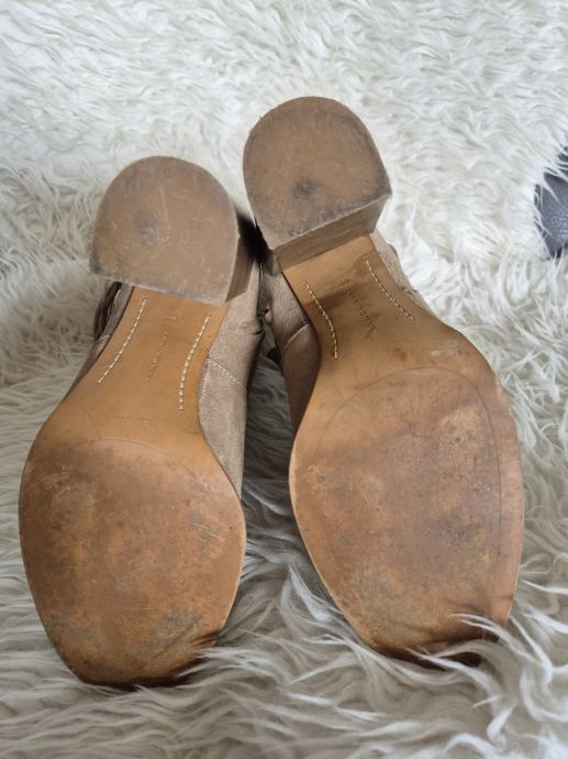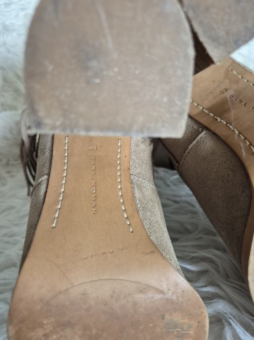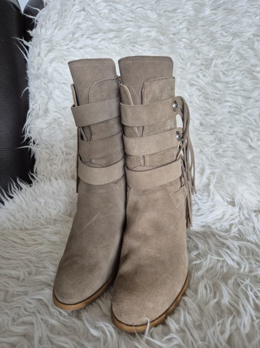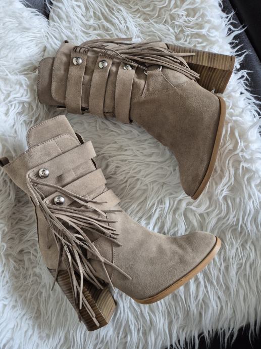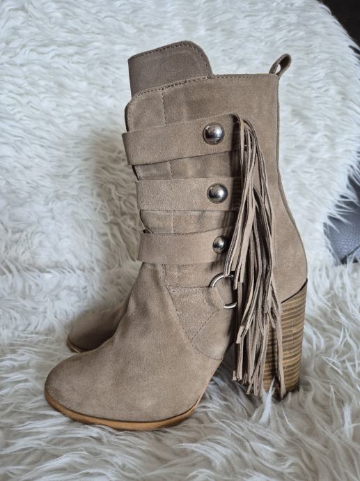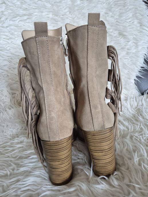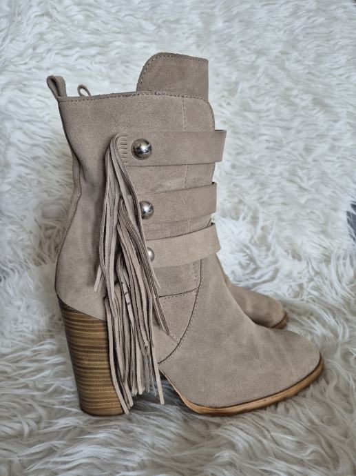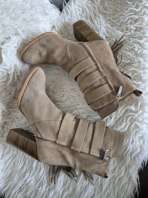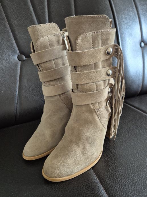 Prodajem rabljene Zara čizme od brušene kože u bež boji, veličine 40. Čizme imaju zanimljiv dizajn s resicama sa strane i dekorativnim metalnim detaljima. Udobne su i stylish, savršene za jesensku i zimsku sezonu.