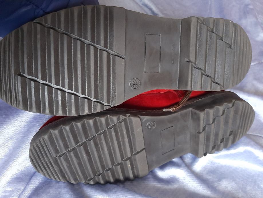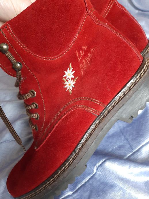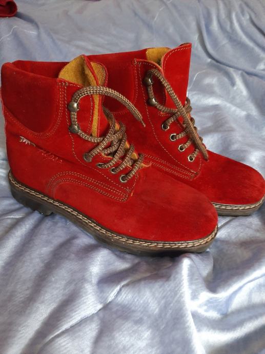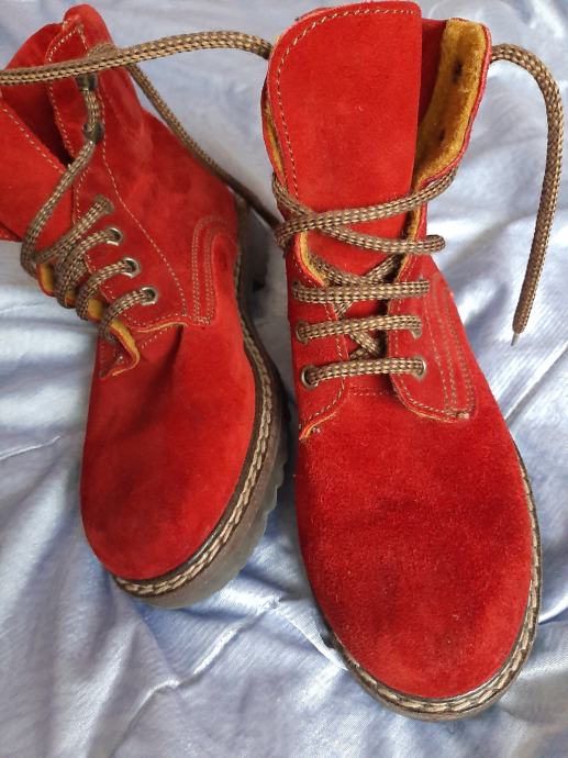 Ženske crvene od velur kože čizmice na vezanje. Nošene vrlo kratko. Iznutra tople s filcom. Vel. 38