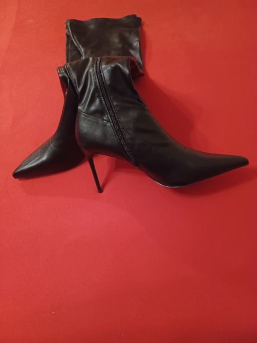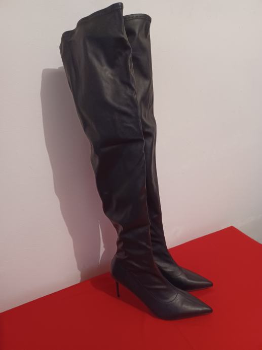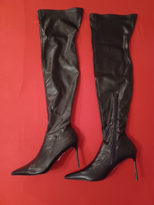 Ženske čizme iznad koljena, broj 46, gazište 29,5- 30,0 cm, višina potpetice 10 cm, dužina 70 cm, široki model.