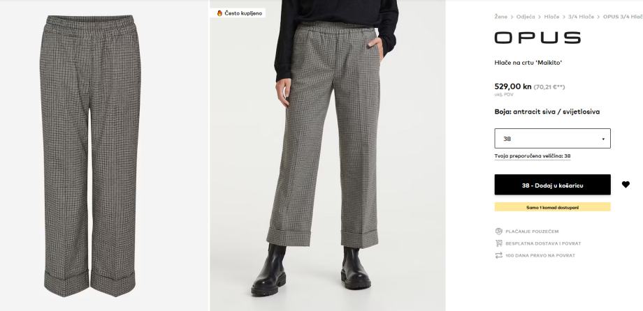Ženske hlače, Opus, model Maikito, karirane u sivim tonovima, s manžetnim porubom, veličina 36 - komotniji model tj. prema 38, nošene par puta, kao nove