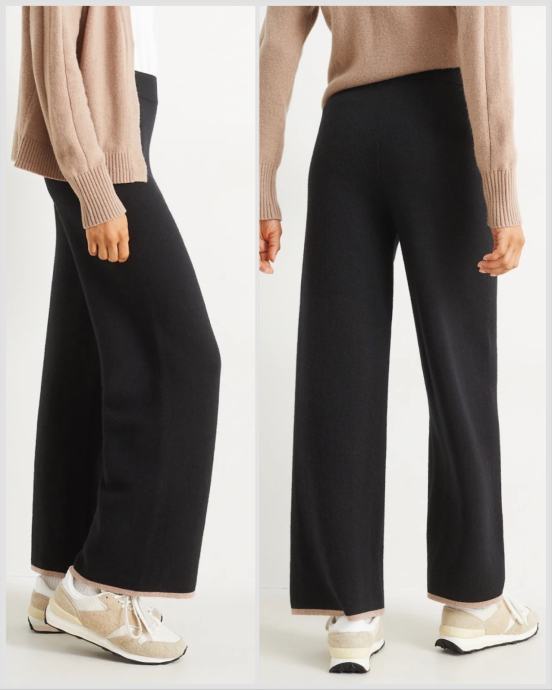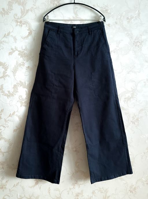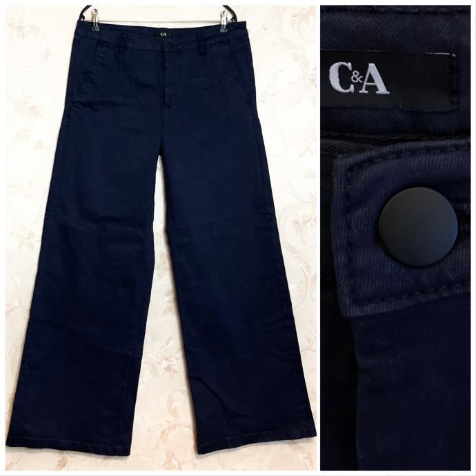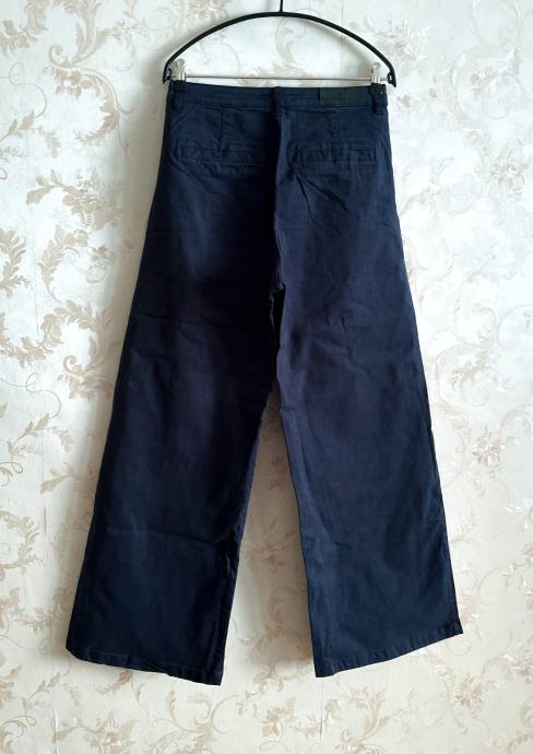 Tamno plave hlače, široke nogavice, cif i gumb sprijeda, prorez dzepici straga.