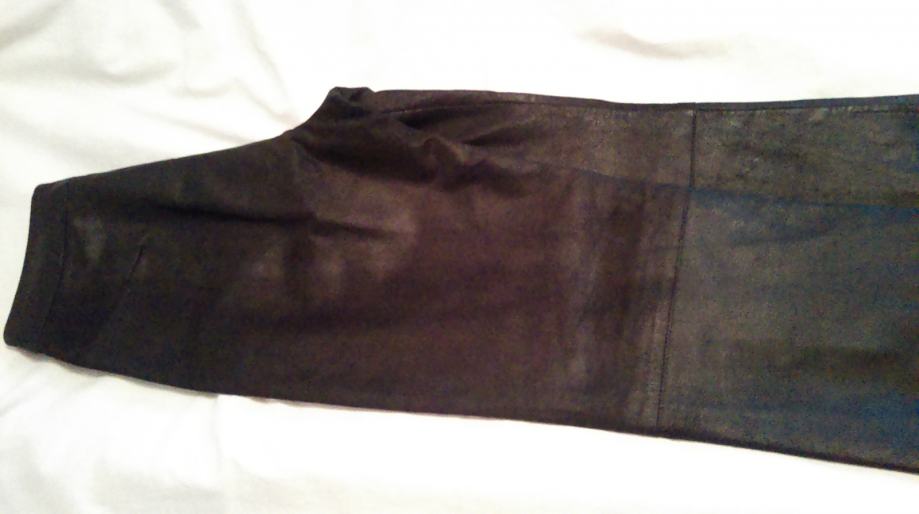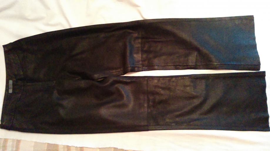 Hlače ravnog klasičnog kroja, visoki struk, veličina 38. Materijal izgleda kao prava koža, jako uvjerljivo (a možda čak i jest obrađena koža). Vrlo efektne i šik. Podstavljene, jako lijepo stoje.