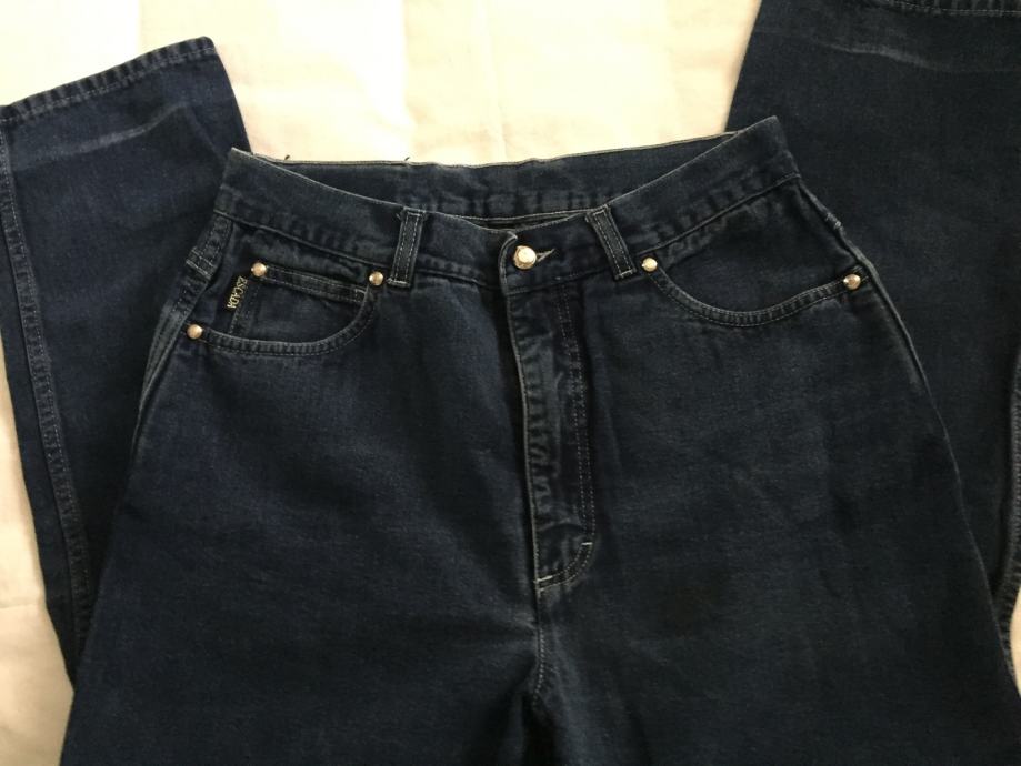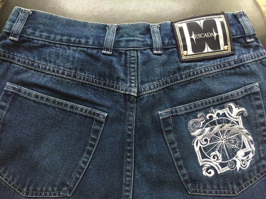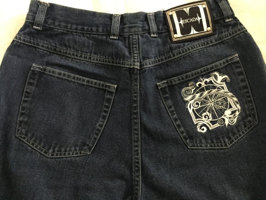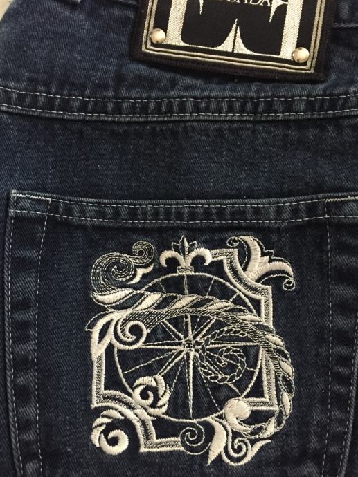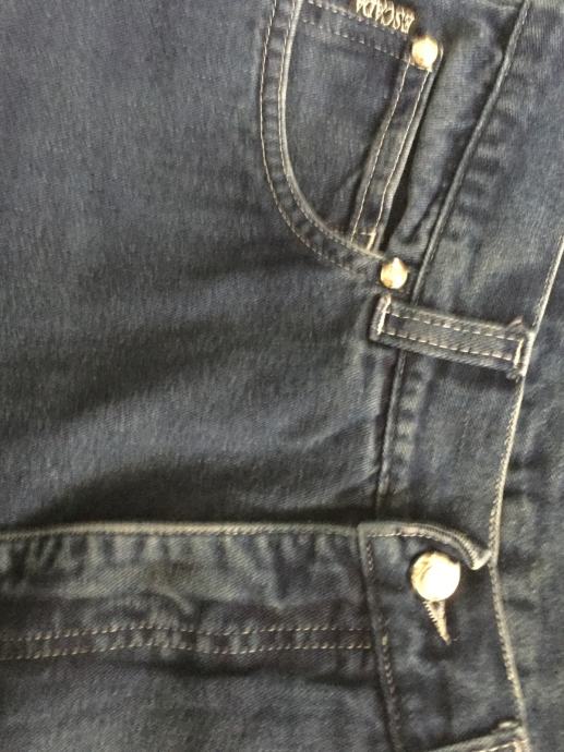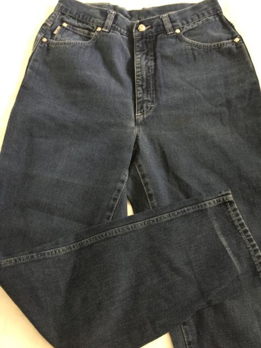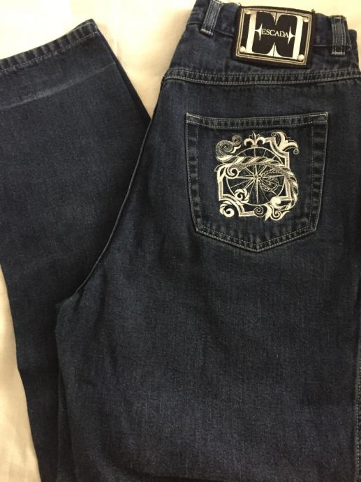 ESCADA JEANS original...made in Italy..efektne traperice sa logom i vezenom aplikacijom..pamuk...vel.42...”mrkva”model vintage...nenošene!