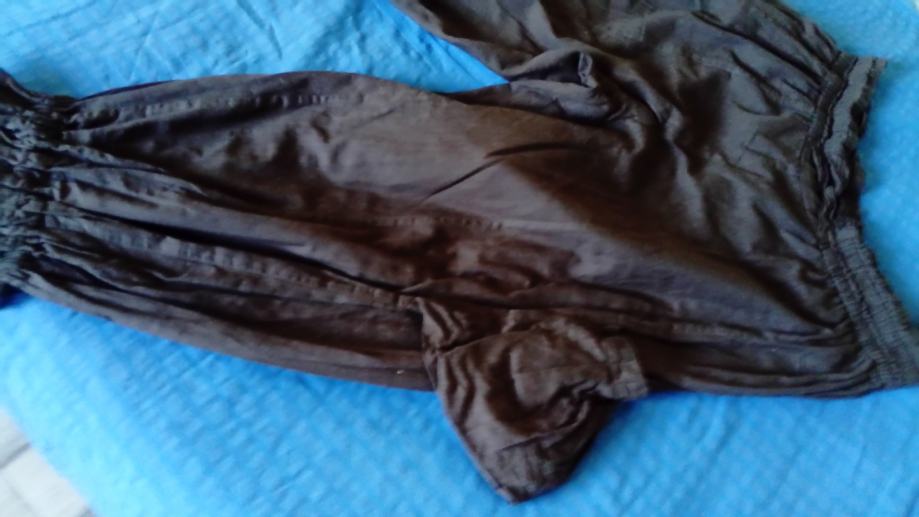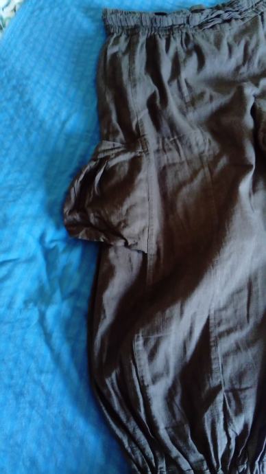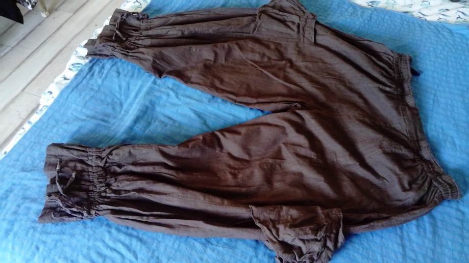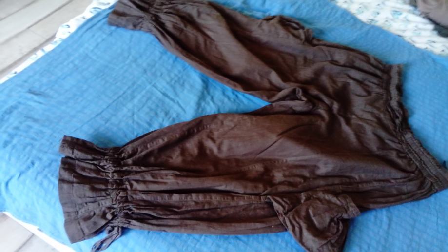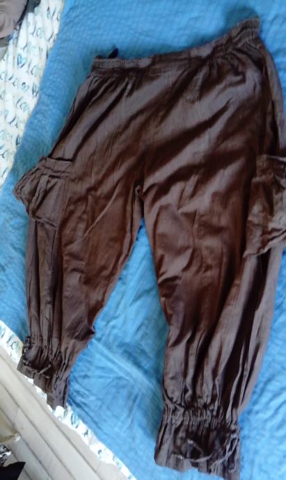 Posebne i neobične ugodne smeđe hlače. Teško ih je opisati jer ima brojne detalje. U struku je gumica pa se rasteže. Sa strane hlača neobični džepovi. Na kraju završava s vezicom kojim se može regulirati koliko ih želite suziti. Mogu se nositi 3/4 ili duge. Skupo plaćene.