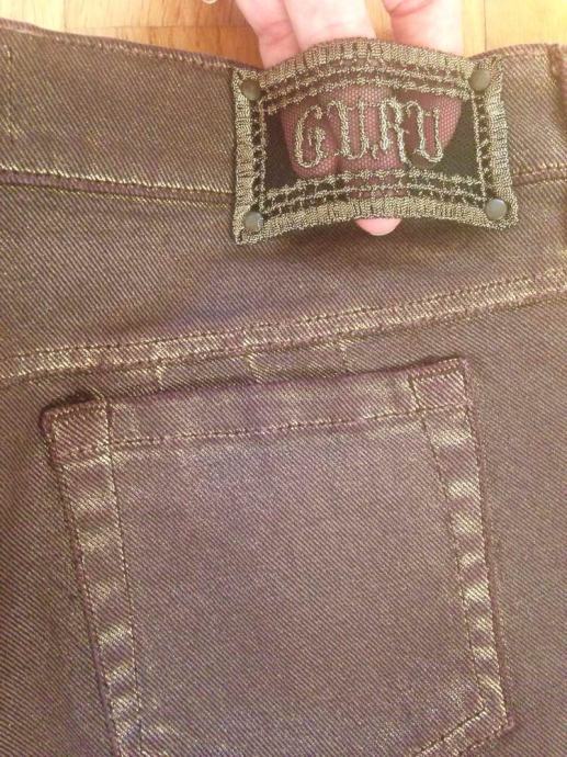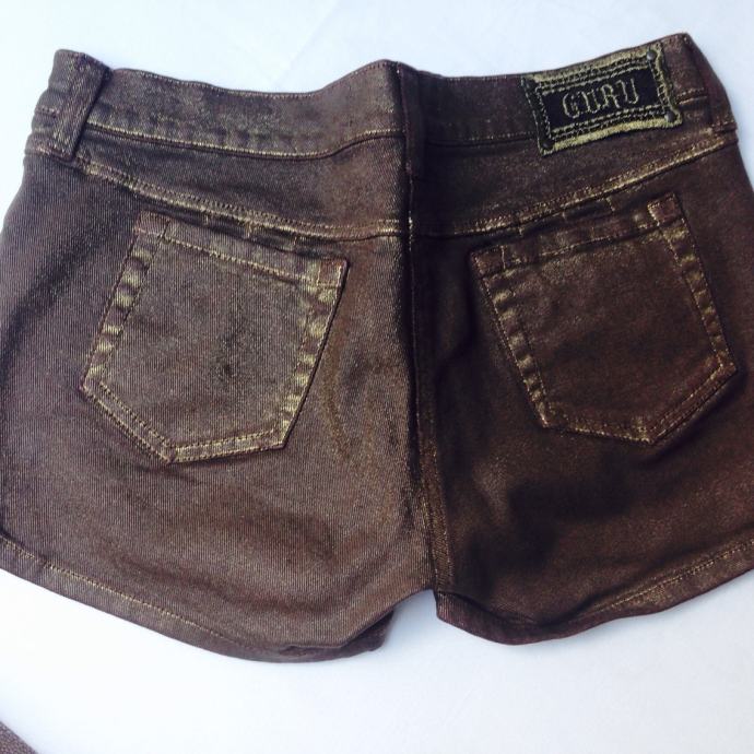 Zlatne trendi hlačice ,marke GURU,veličina 28,dužina 25 cm,jednom oprane,kao nove.