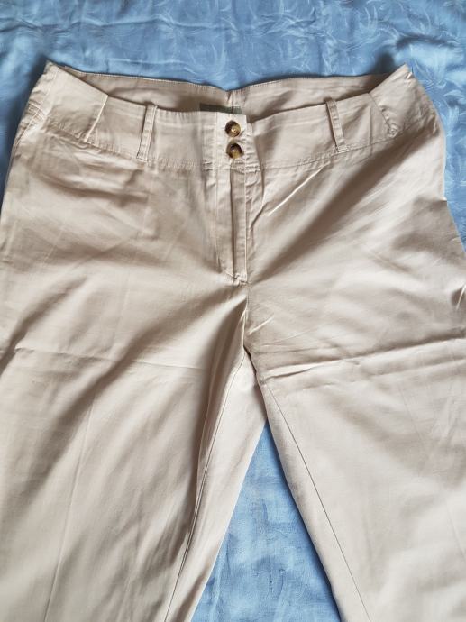 H&M hlače krem boje, svilenkastog materijala, udobne, navedena veličina 44, no mislim da više odgovara broju 42 (L). Malo nošene, očuvane. Tanjeg materijala. Slikane bez i sa blicem.