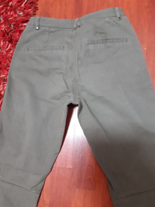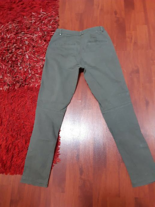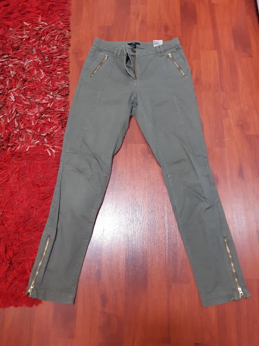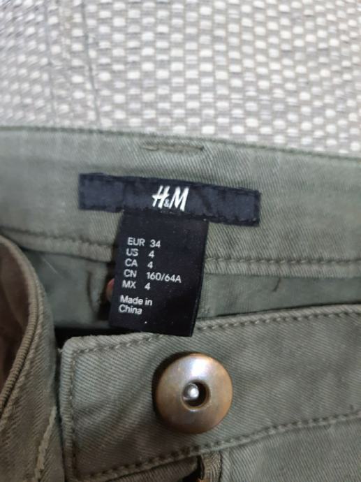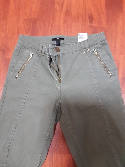 H & M maslinastozelene skinny hlače s patentima na kosim džepovima, vel. 34. Sirina struka, samo prednja strana: 36 cm, bokova: 44 cm, duzina nogavice: 90 cm, dubina prednjice: 21 cm.