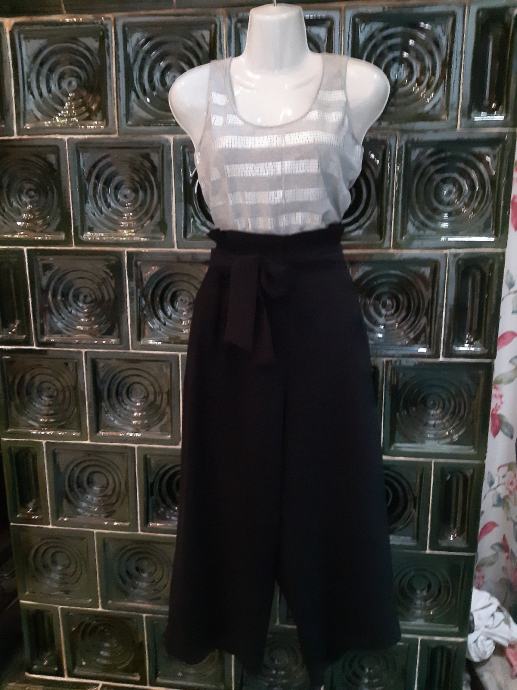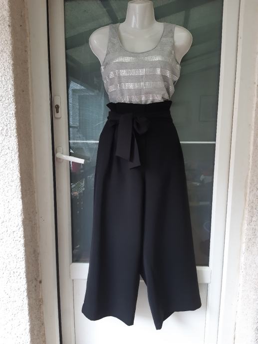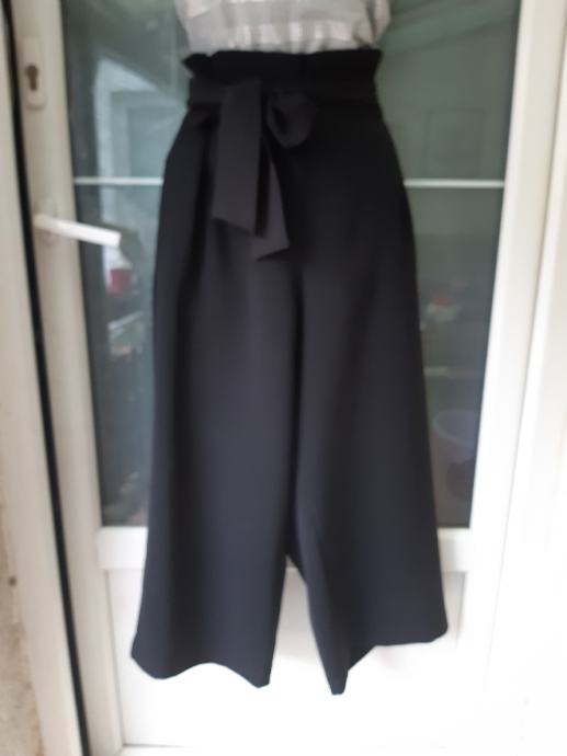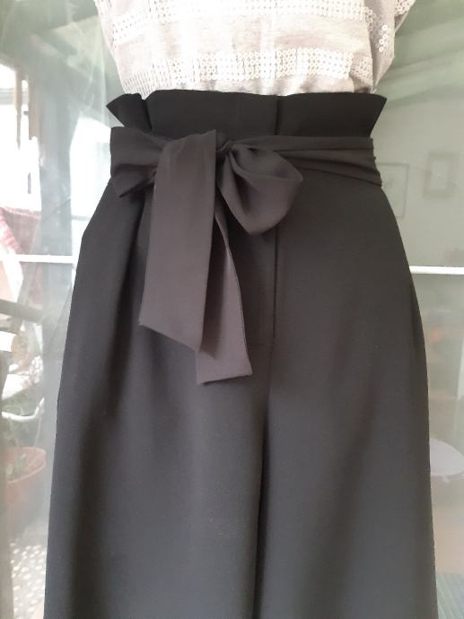 H & M siroke crne hlače visokog struka s remenom na vezanje, vel. 40. Širina struka, prednja strana: 40 cm, bokova: 49 cm, duzina nogavice: 91 cm, dubina prednjice: 39 cm. Sastav: 80 % poliester, 20% pamuk.