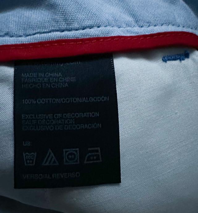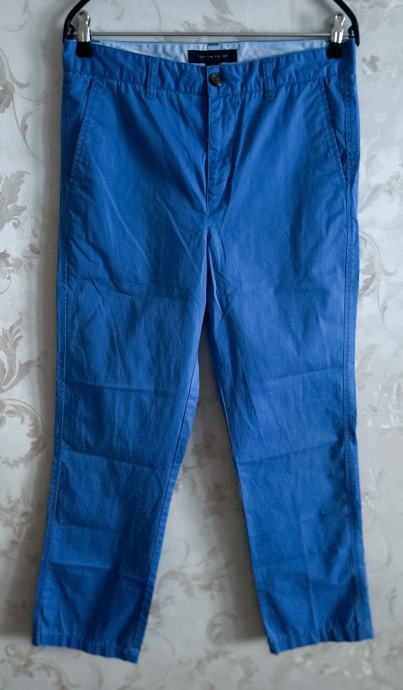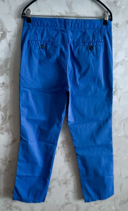 Plava boja, kosi džepovi sprijeda, ravne slimming nogavice.